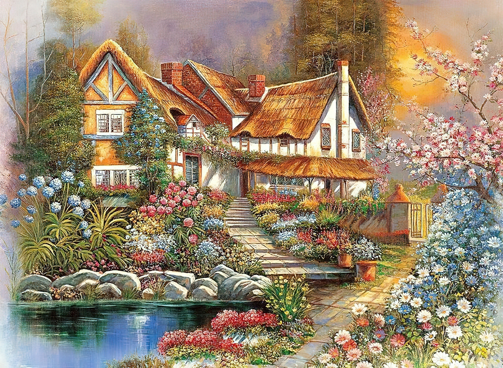 Edytor tapety: Dom, Schody, Ogród, Jezioro, Staw