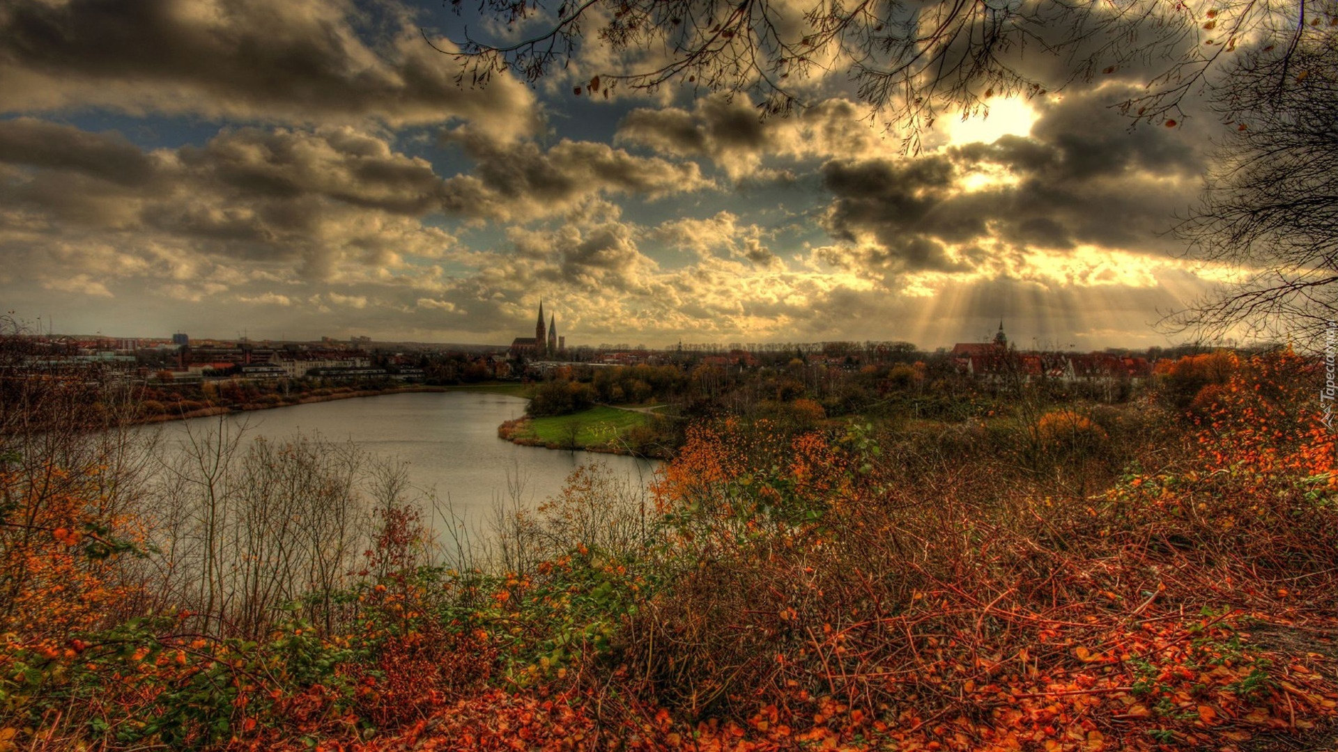 Edytor tapety: Chmury, Przebijające, Światło, Jezioro, Jesień
