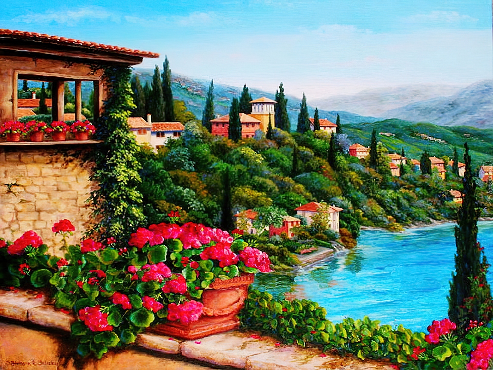 Edytor tapety: Taras, Kwiaty, Domy