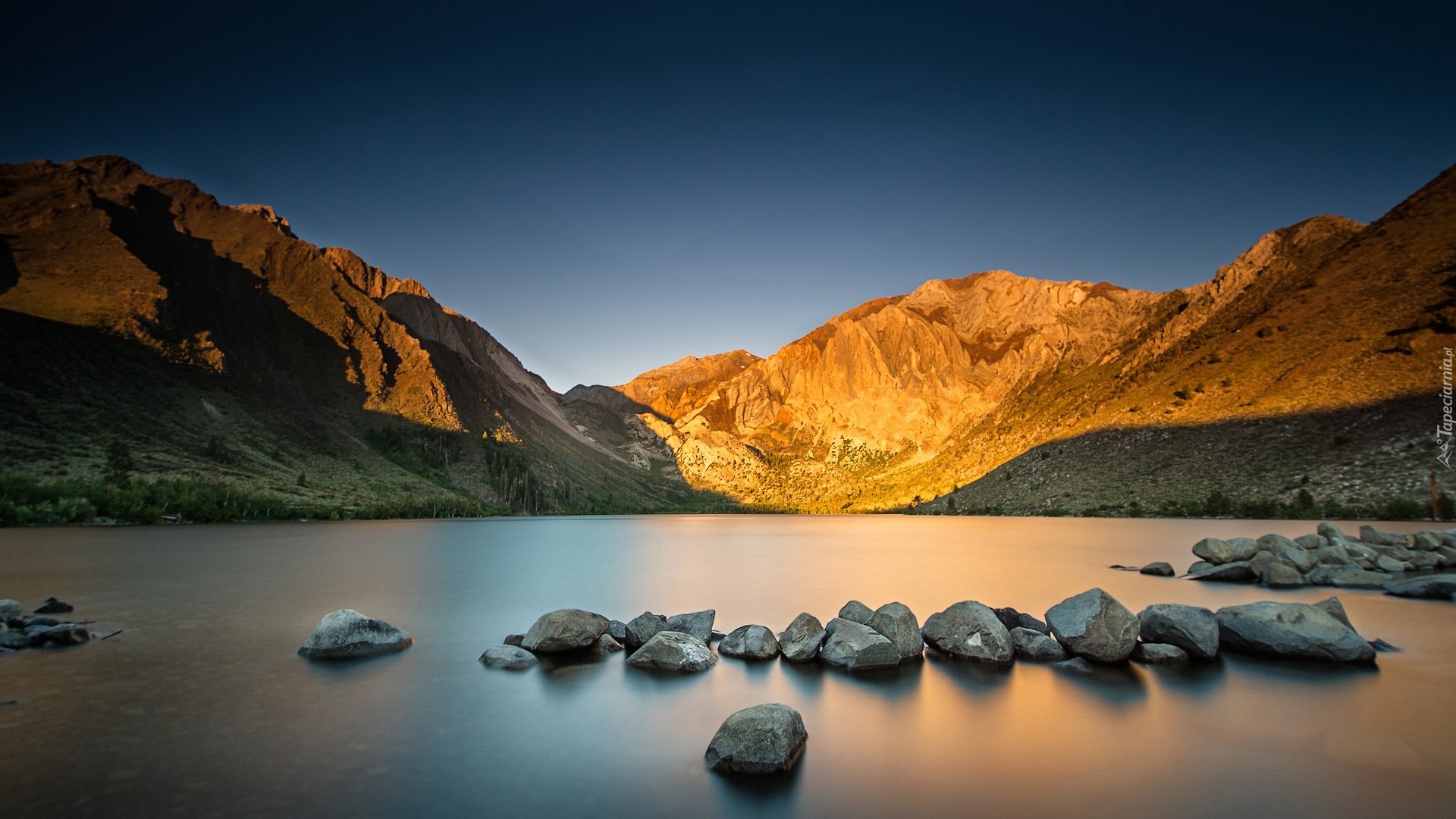 Edytor tapety: Góry, Rzeka, Kamienie, Przebijające, Światło