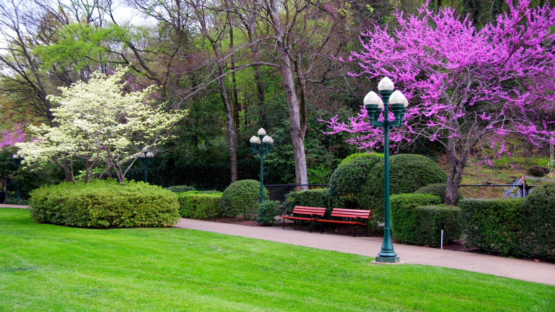 Edytor tapety: Park, Kwitnące, Drzewa, Latarnia