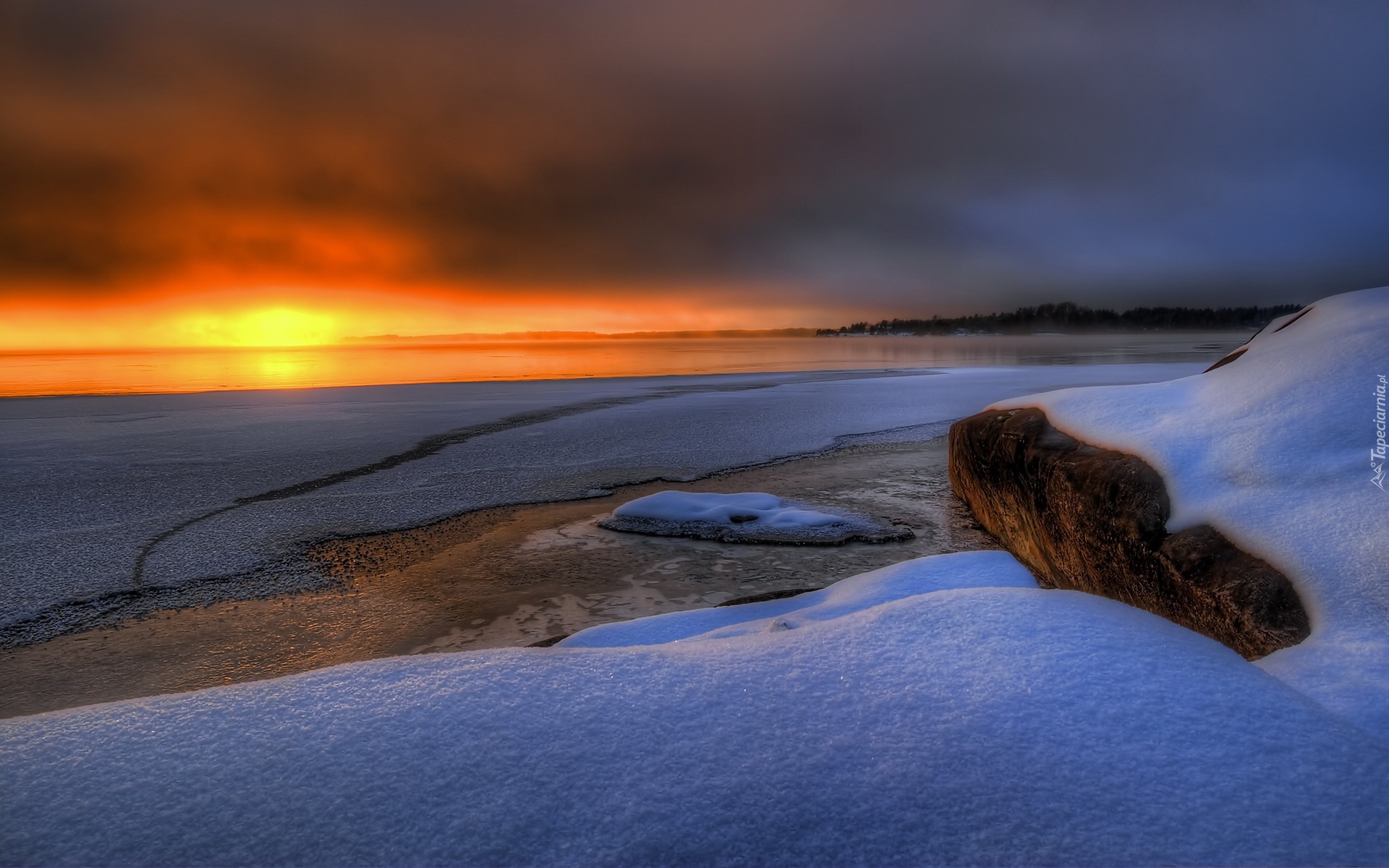 Edytor tapety: Jezioro, Chmury, Zachód, Słońca, Śnieg