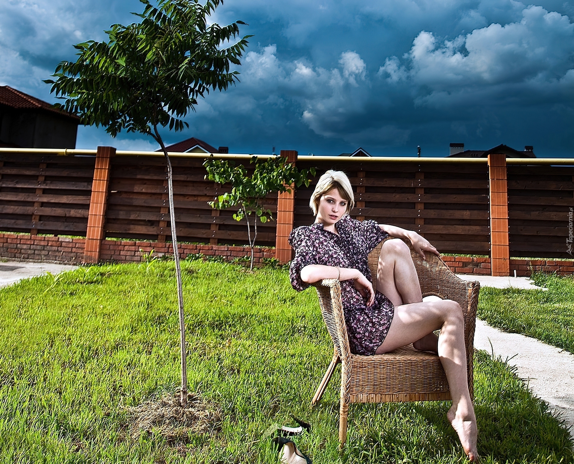 Edytor tapety: Kobieta, Siedząca, Chmury, Ogród
