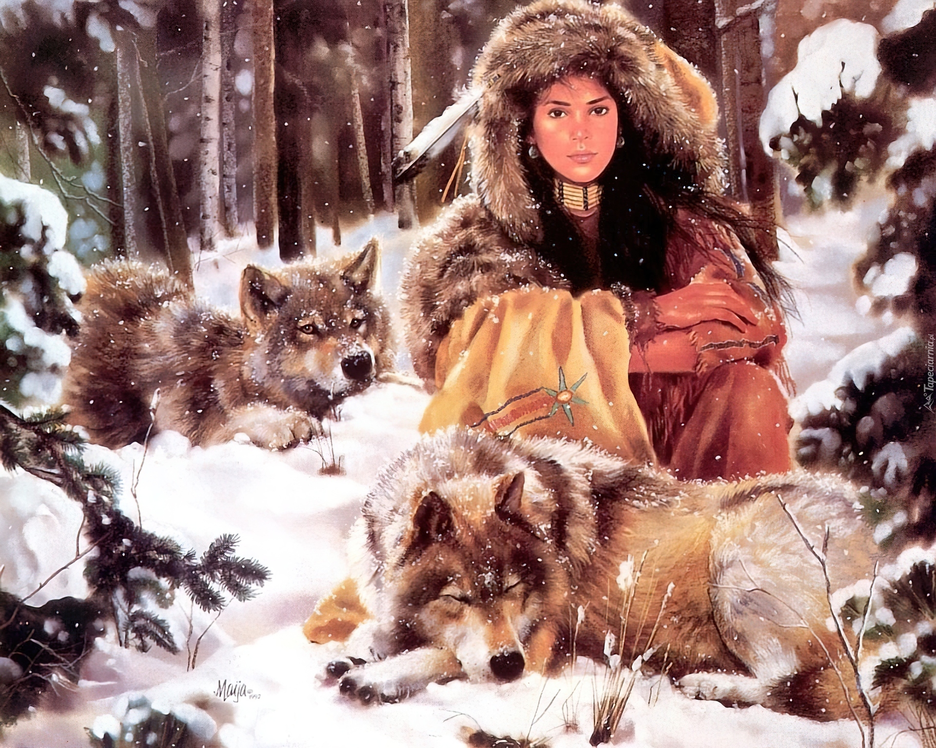 Edytor tapety: Dziewczyna, Młoda, Indianka, Wilki, Zima