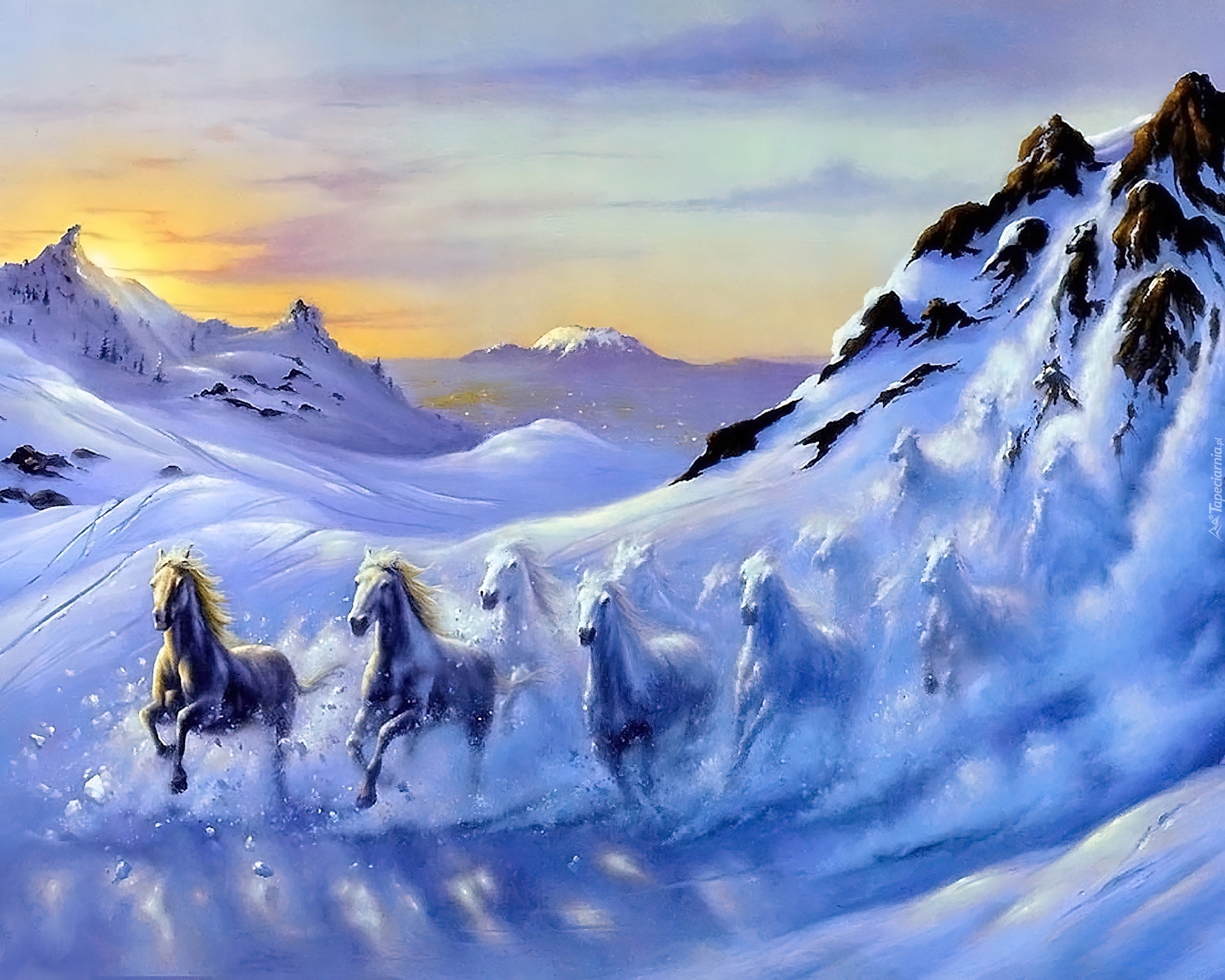 Edytor tapety: Zima, Śnieg, Góry, Pędzące, Konie