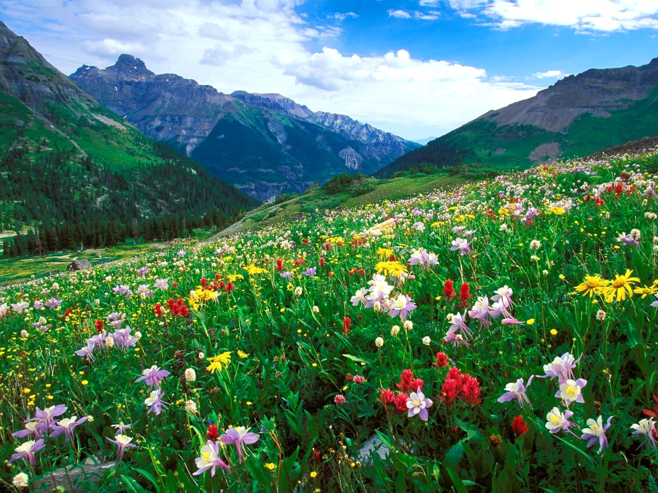 Edytor tapety: Łąka, Kwiaty, Góry