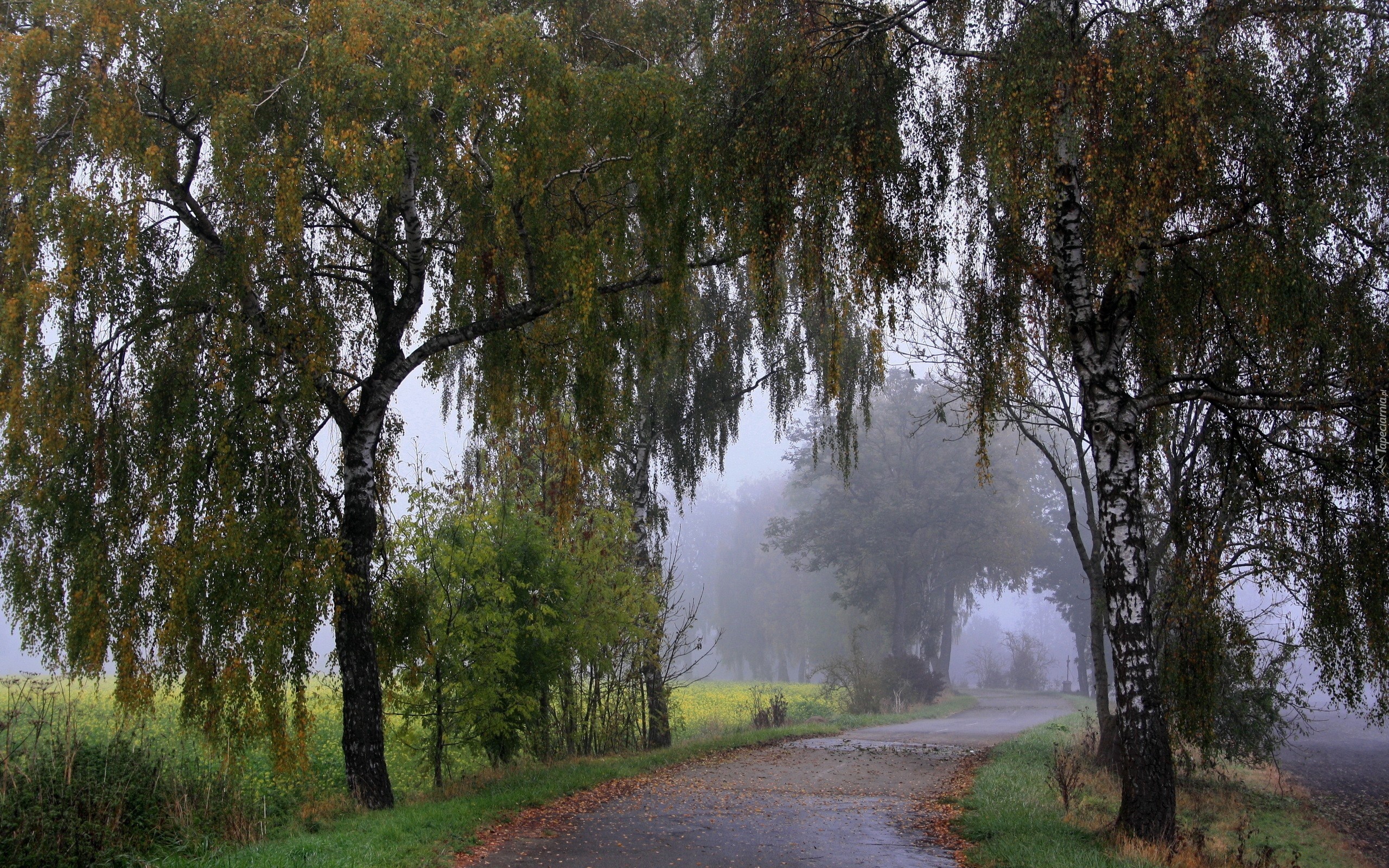 Edytor tapety: Droga, Pola, Brzozy, Mgła