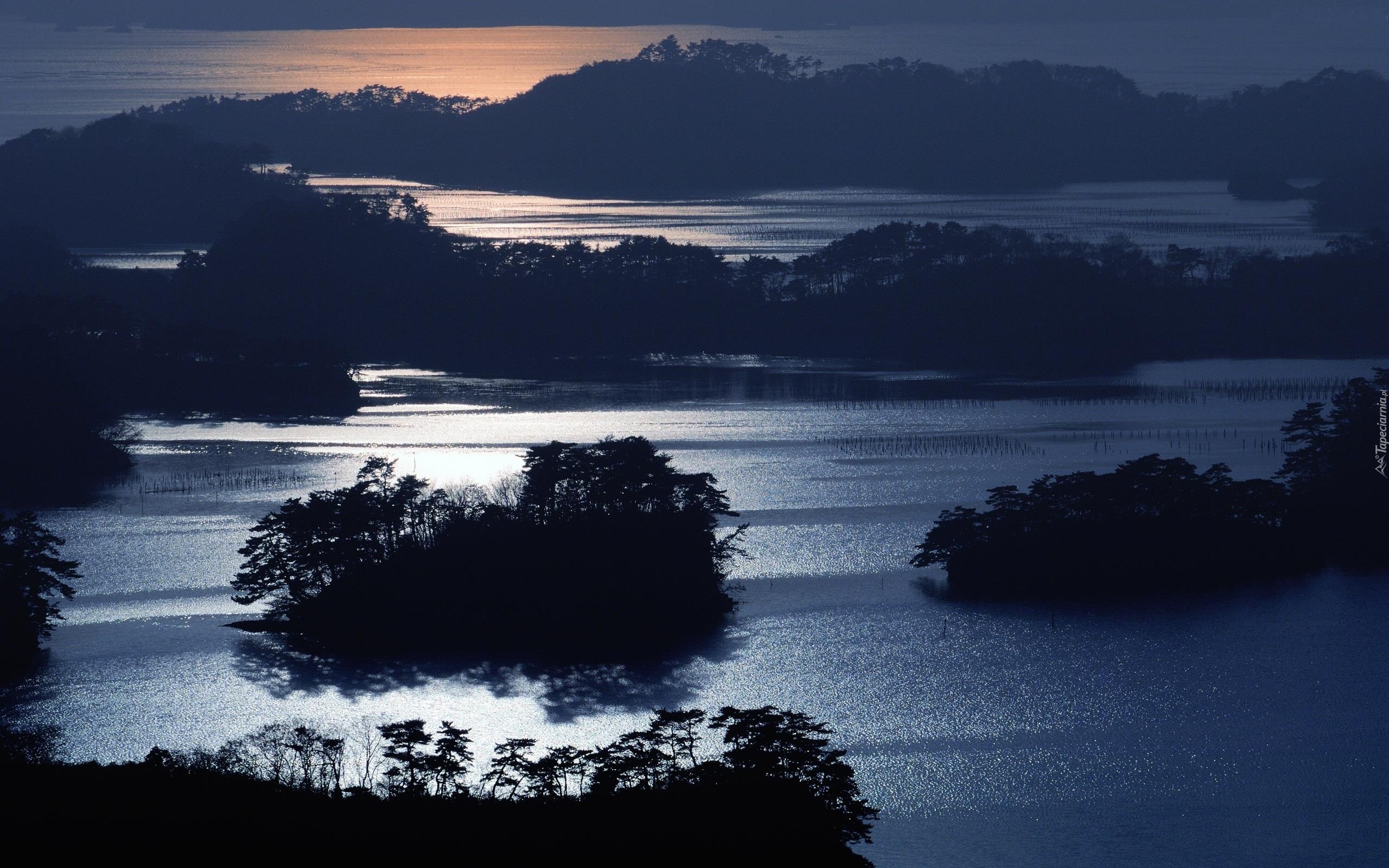 Edytor tapety: Jezioro, Wysepki, Zachód, Słońca
