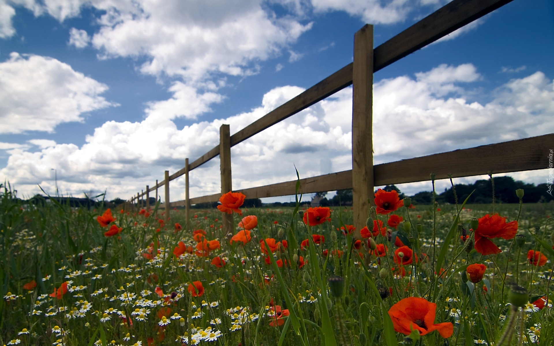 Edytor tapety: Łąka, Maki, Płotek, Chmury