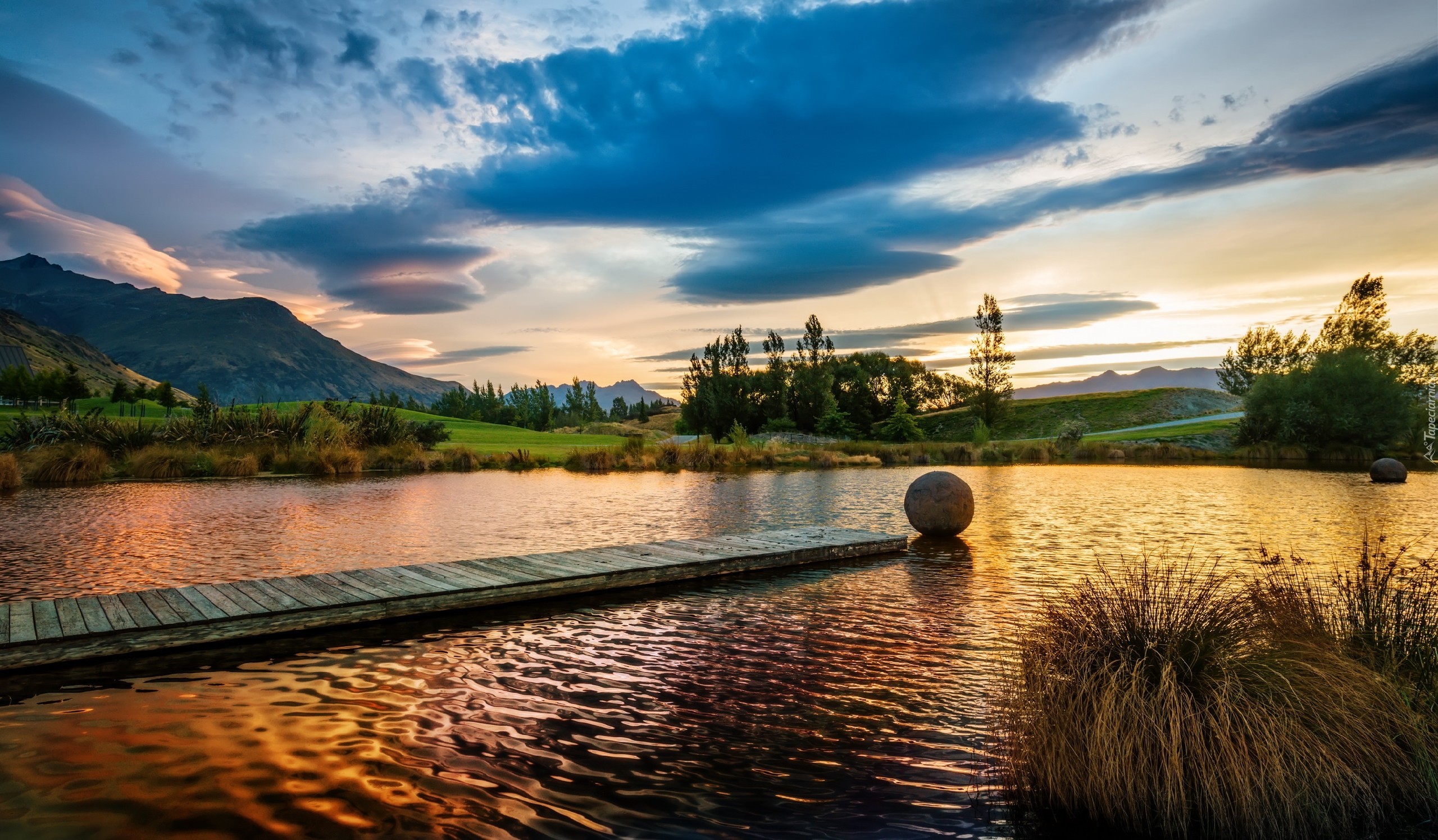 Edytor tapety: Jezioro, Molo, Drzewa, Góry