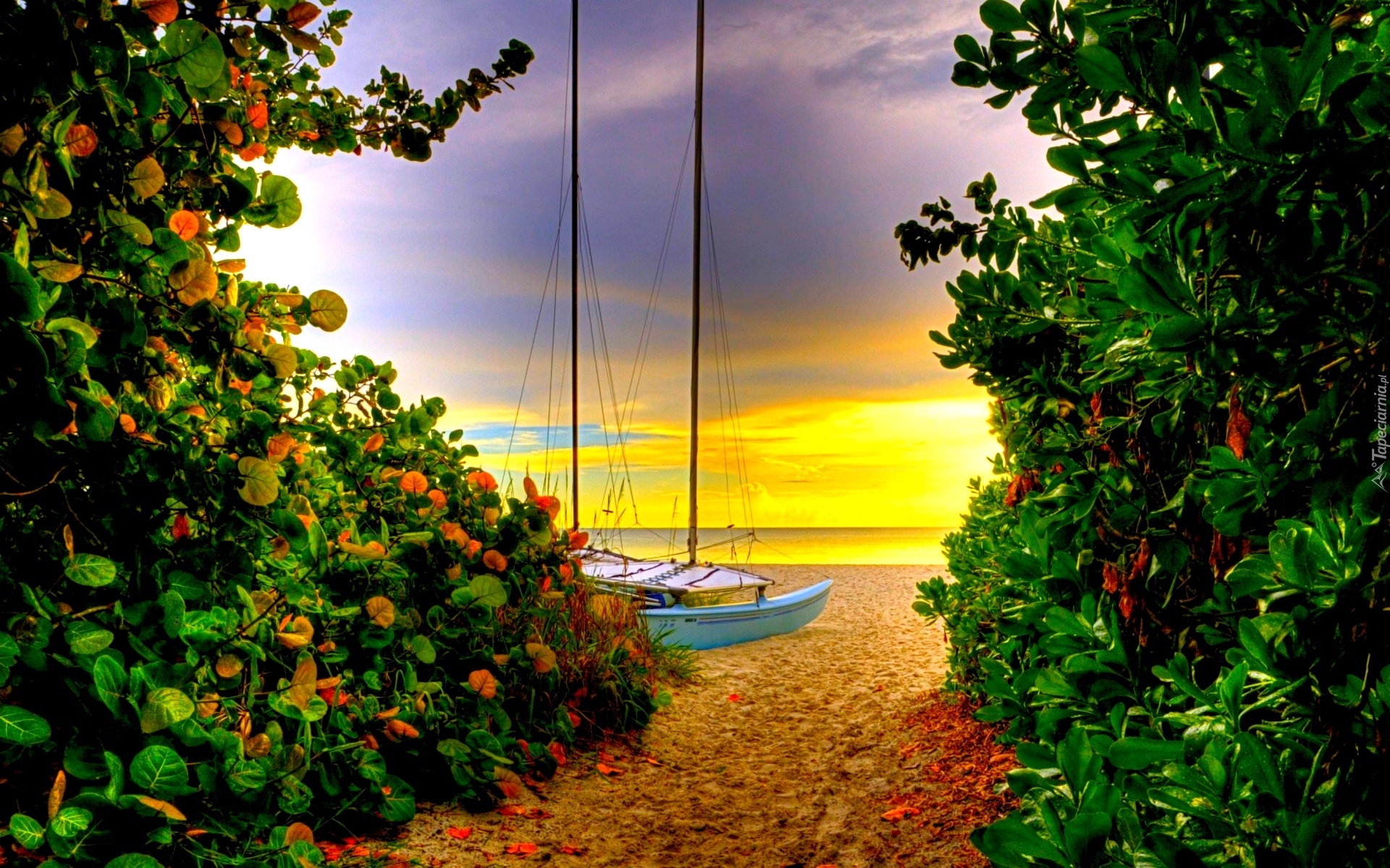 Edytor tapety: Jacht, Krzewy, Morze, Plaża
