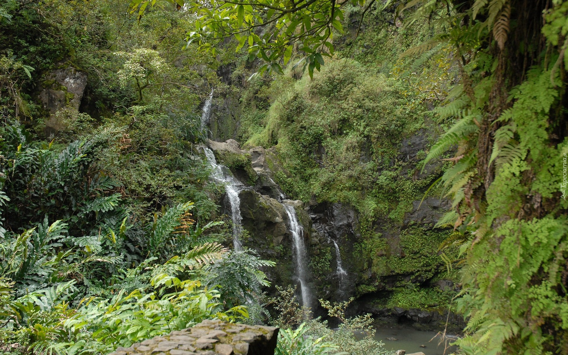 Edytor tapety: Wodospad, Góry, Skała, Drzewo, Krzew