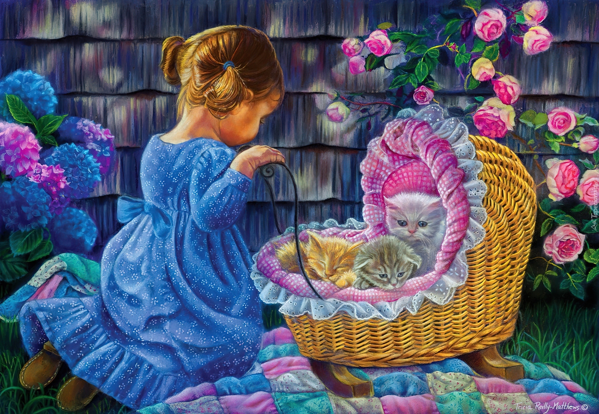 Edytor tapety: Dziewczynka, Wózek, Trzy, Małe, Kotki