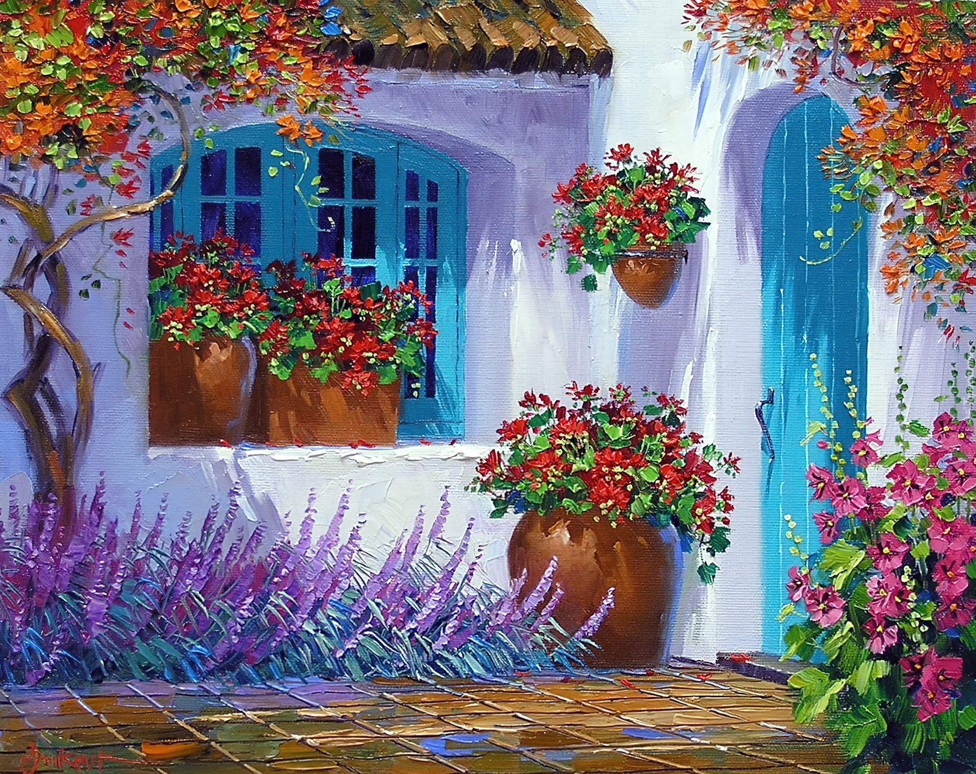 Edytor tapety: Dom, Niebieskie, Drzwi, Okno, Kwiaty