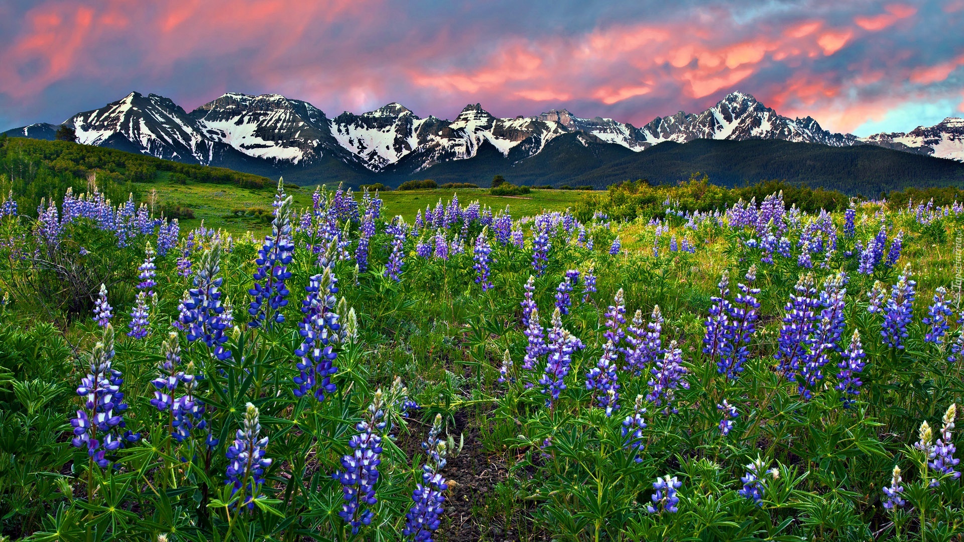 Edytor tapety: Łąka, Kwiaty, Łubin, Góry
