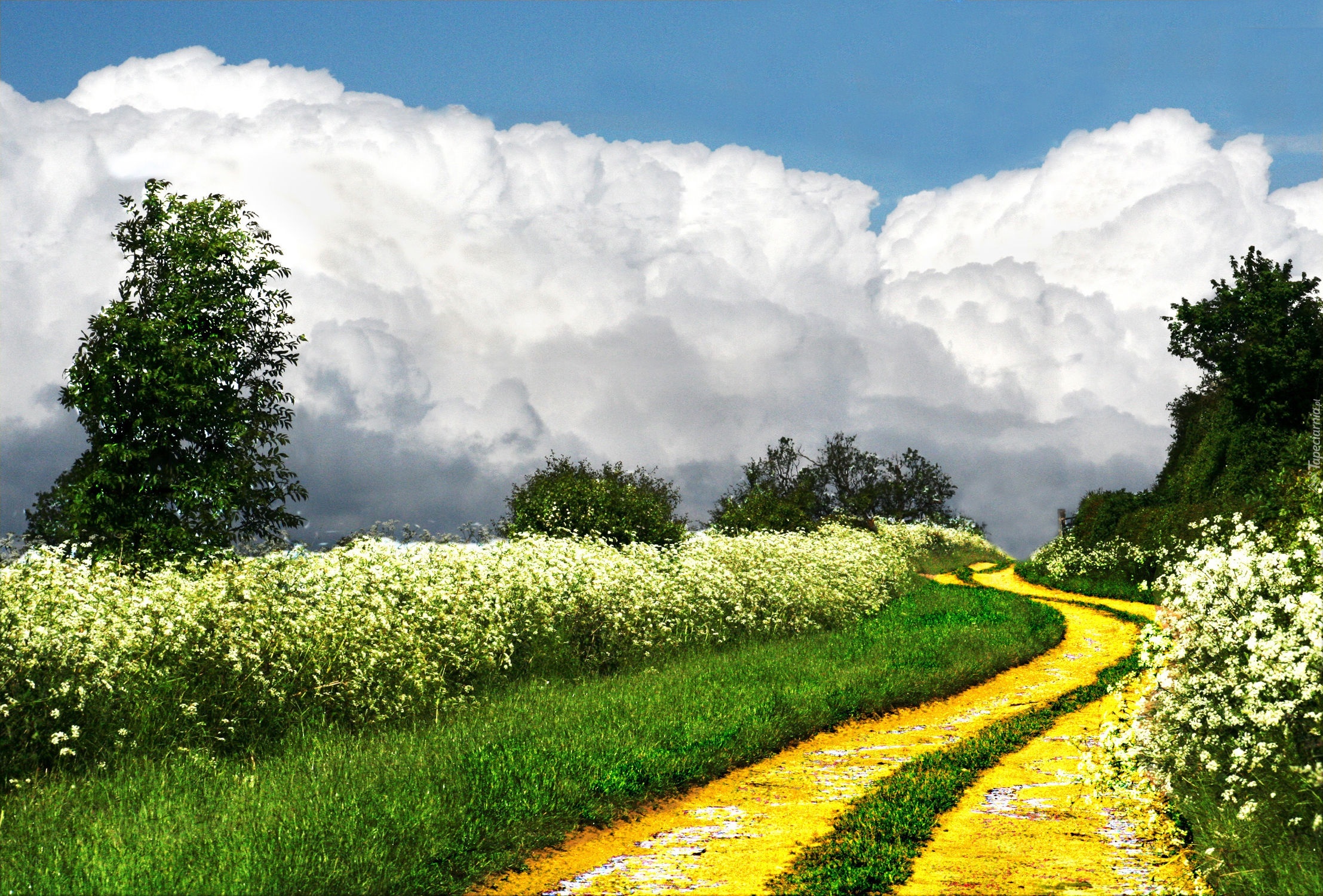 Edytor tapety: Droga, Kwiaty, Drzewa, Chmury