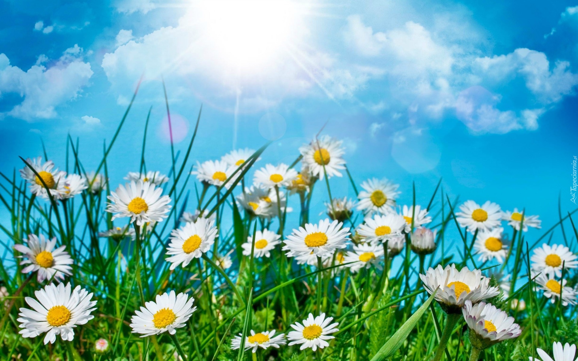 Edytor tapety: Łąka, Stokrotki, Trawa, Chmury, Słońce
