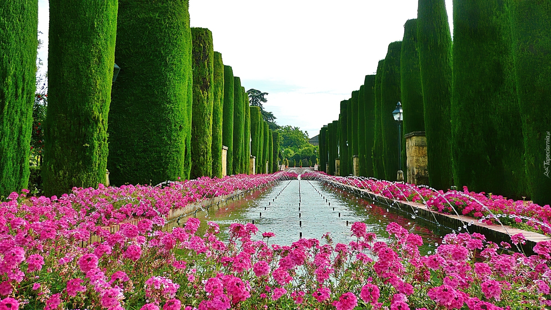 Edytor tapety: Ogród, Kwiaty, Iglaki, Fontanna