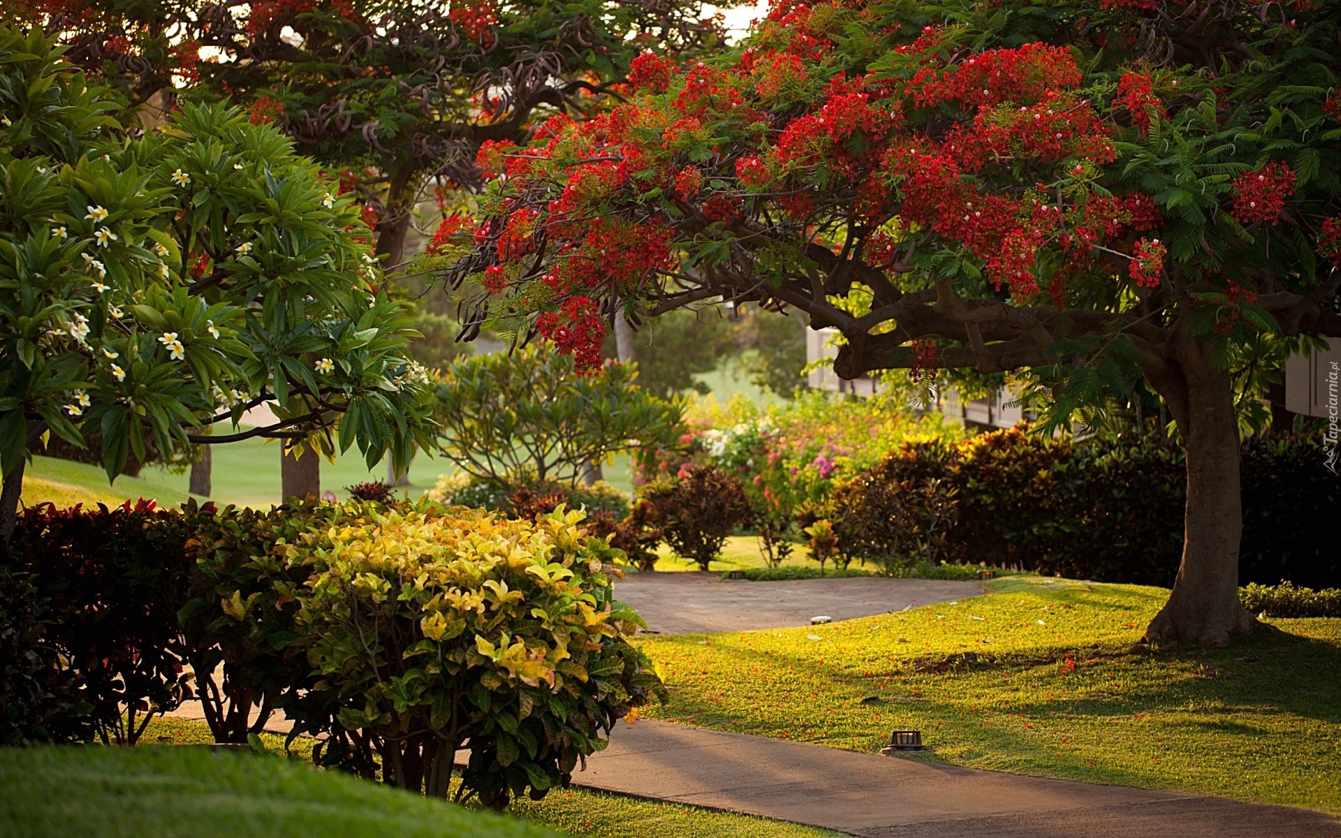 Edytor tapety: Park, Alejka, Kwitnące, Drzewo, Krzewy