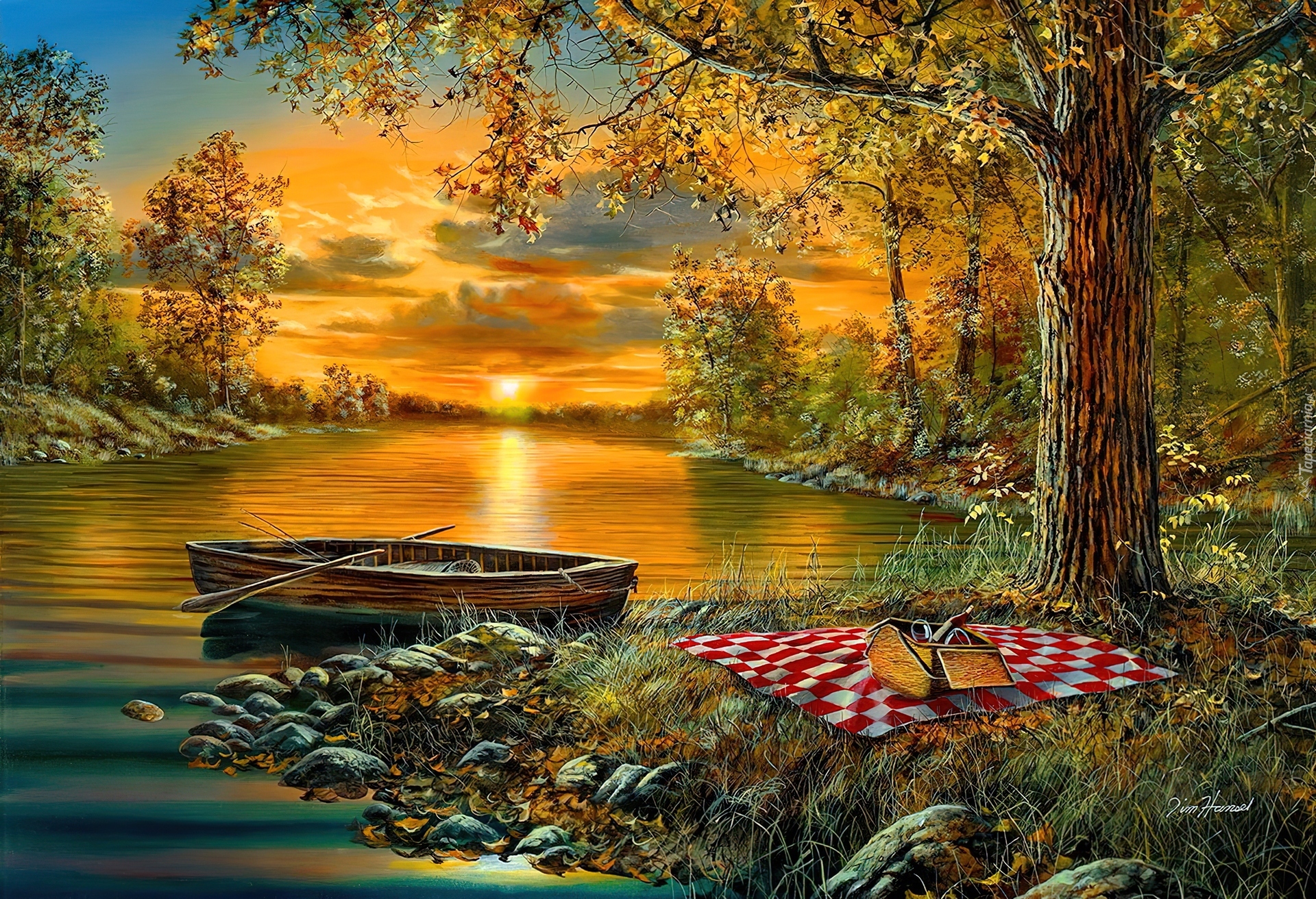 Edytor tapety: Jezioro, Łódka, Zachód, Słońca, Koc