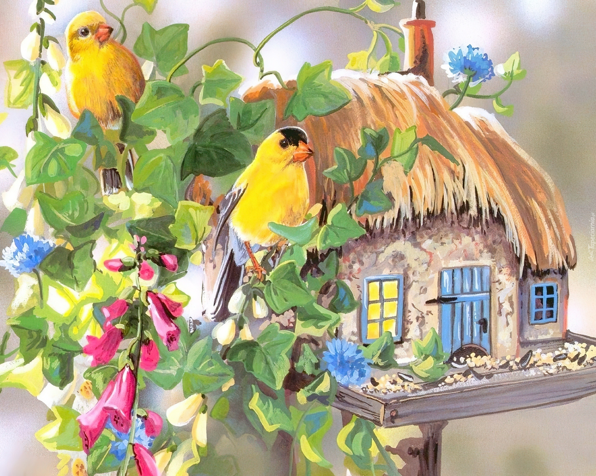 Edytor tapety: Karmnik, Żółte, Ptaki, Kwiaty
