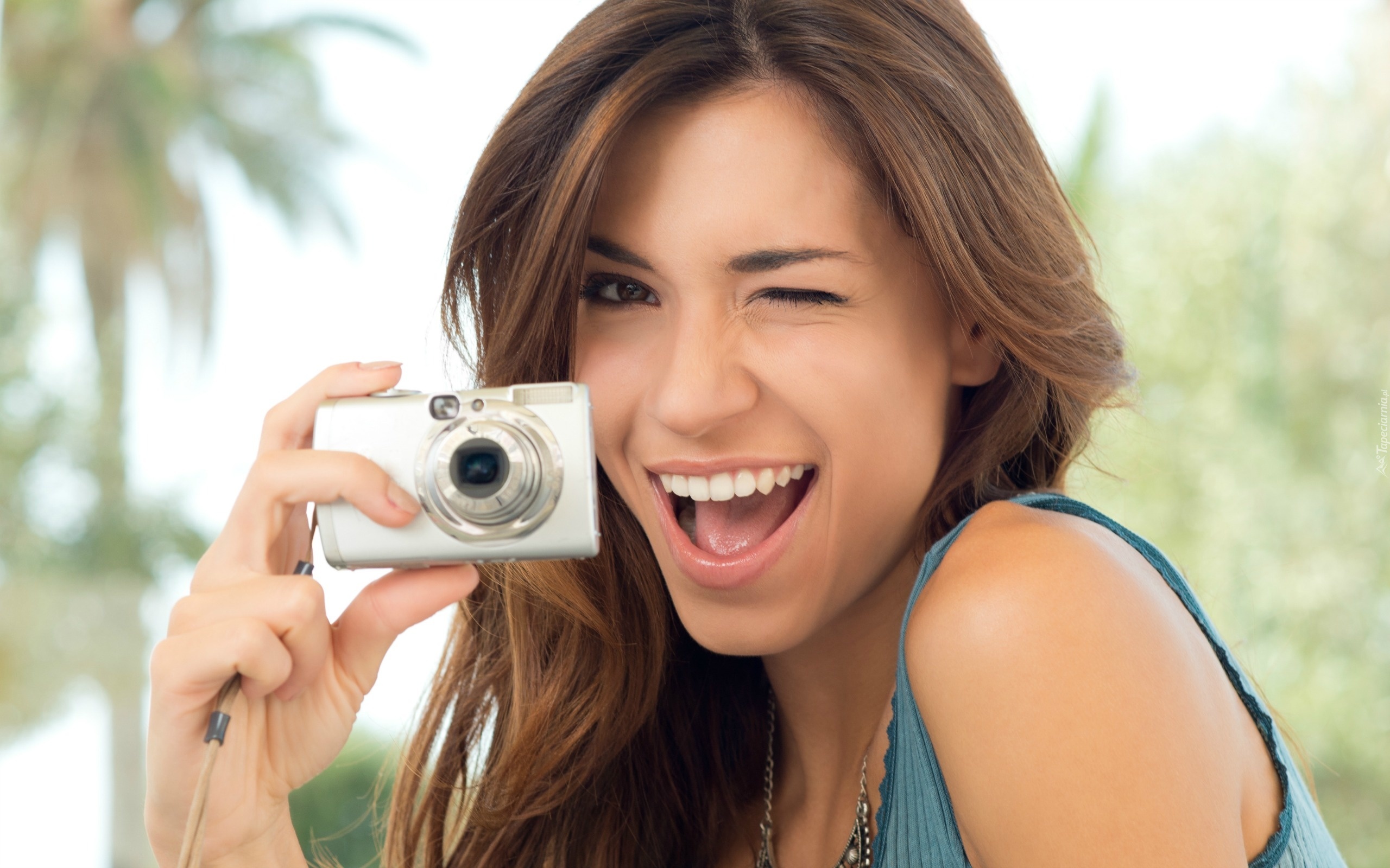 Edytor tapety: Uśmiechnięta, Brunetka, Aparat, Fotograficzny