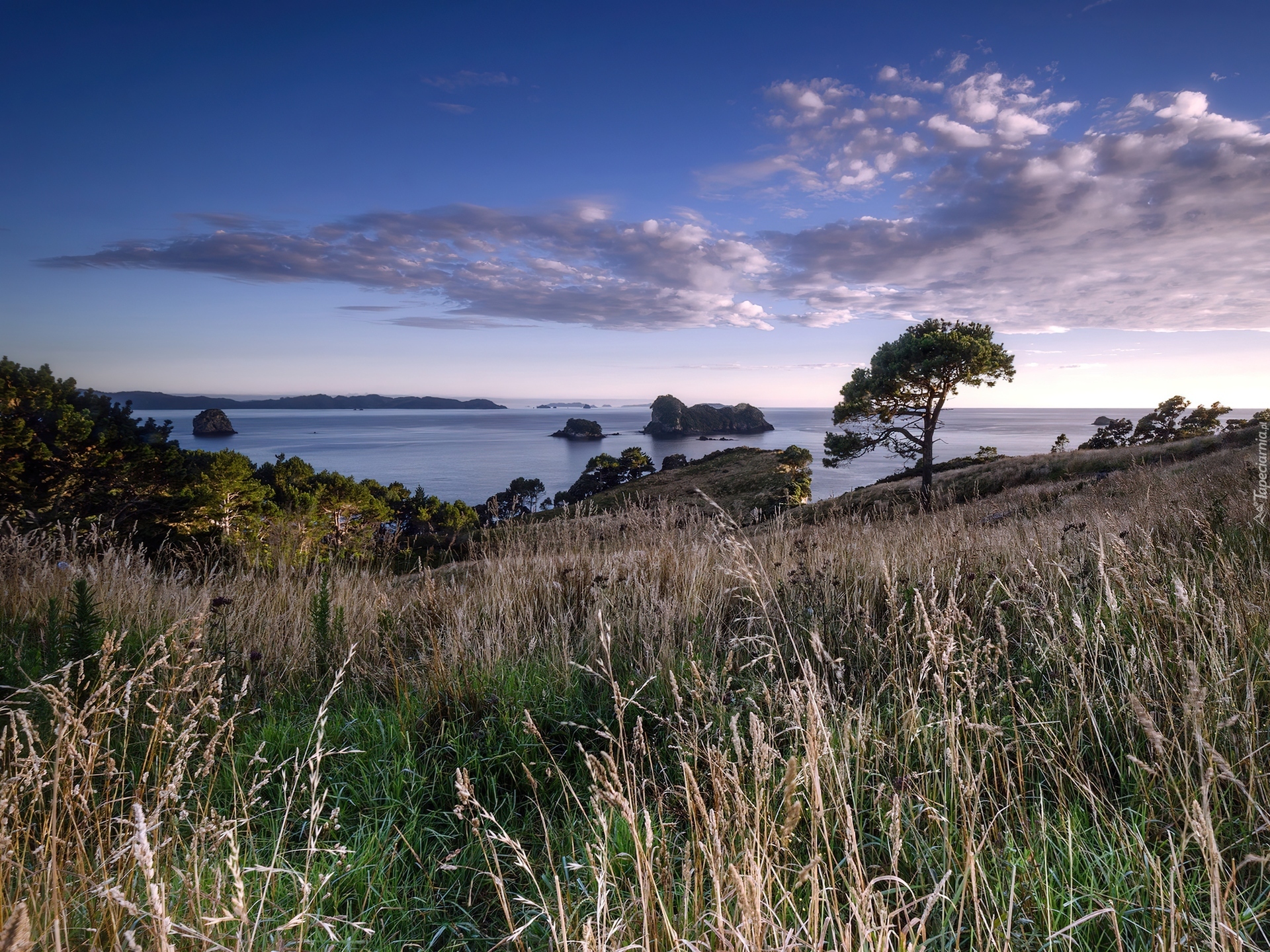 Edytor tapety: Wybrzeże, Trawa, Wyspy, Drzewa, Chmury