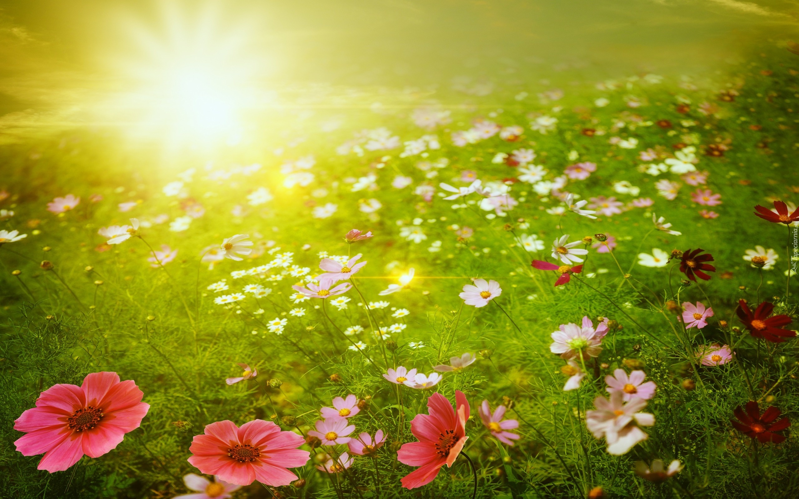 Edytor tapety: Łąka, Kwiaty, Promienie, Słońca