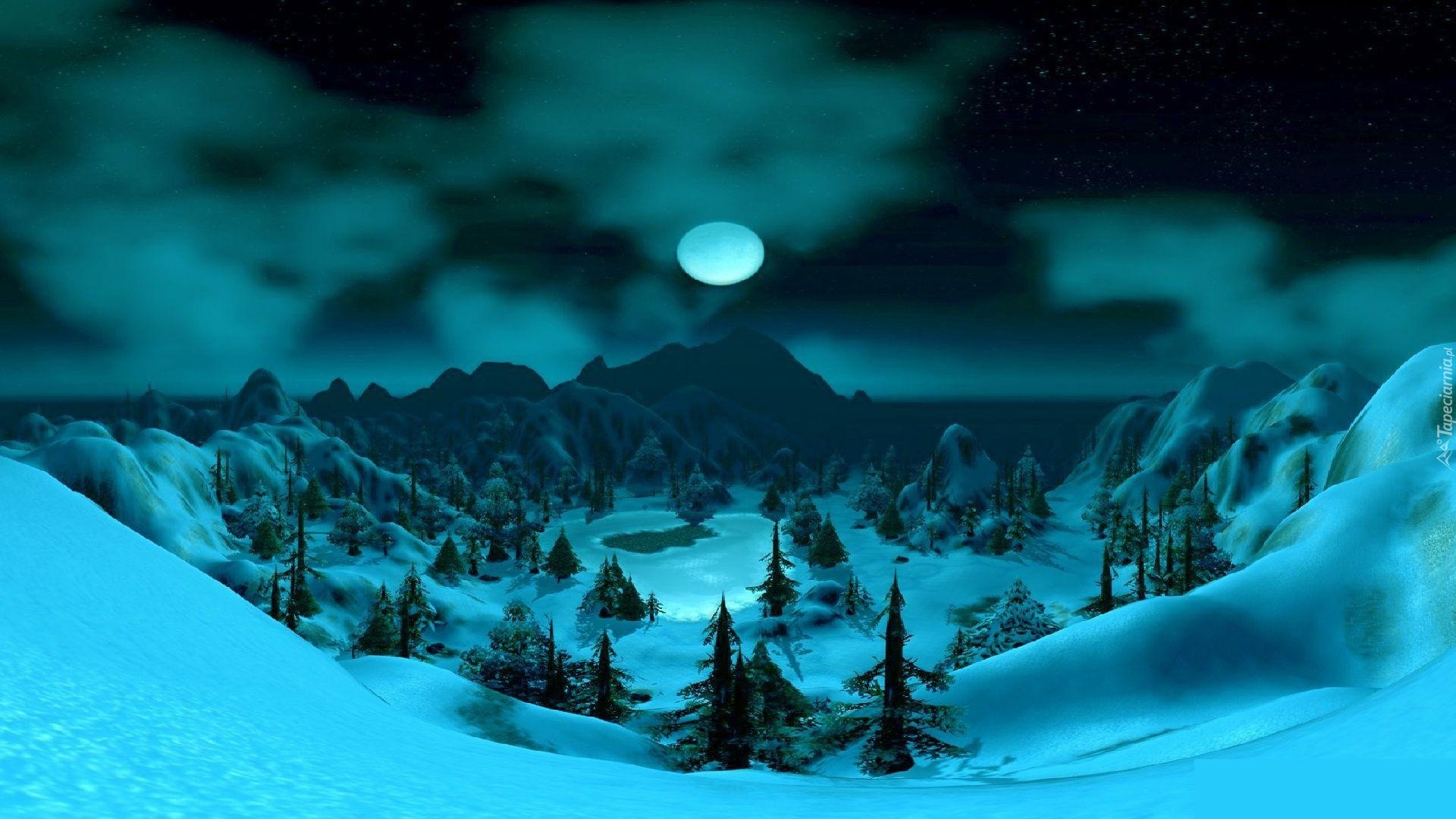 Edytor tapety: Zima, Drzewa, Góry, Księżyc, Noc