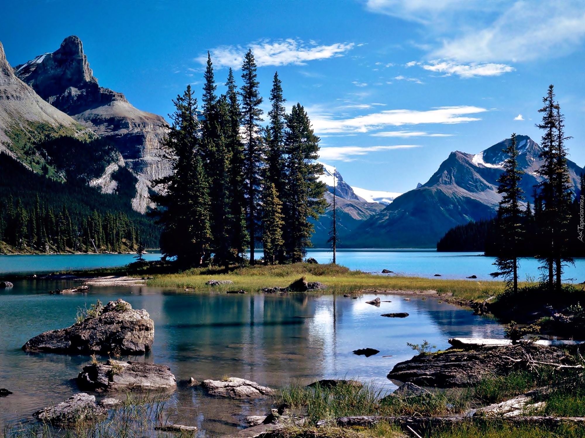 Edytor tapety: Jezioro, Wysepka, Drzewa, Góry
