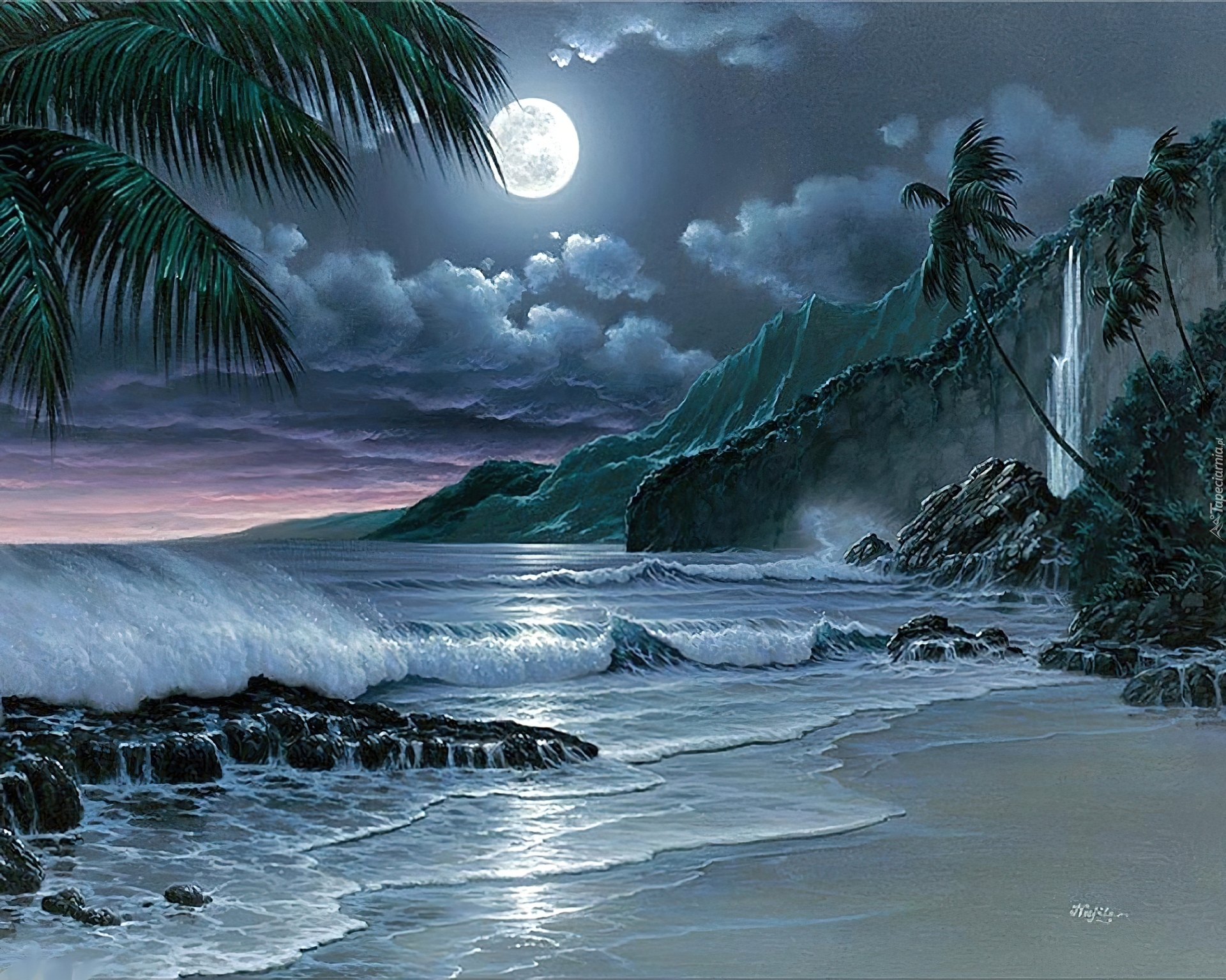 Edytor tapety: Morze, Plaża, Góry, Noc, Księżyc