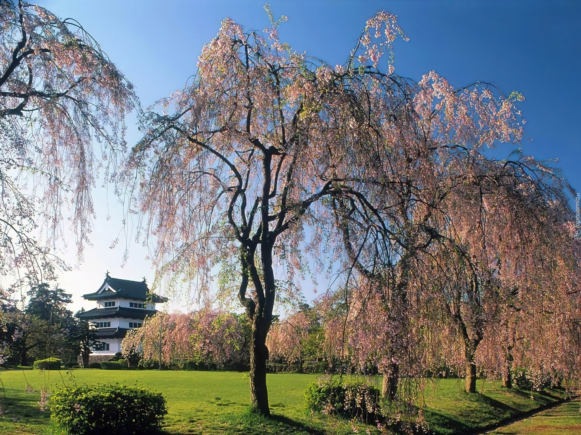 Edytor tapety: Kwitnące, Drzewa, Dom, Japonia, Wiosna