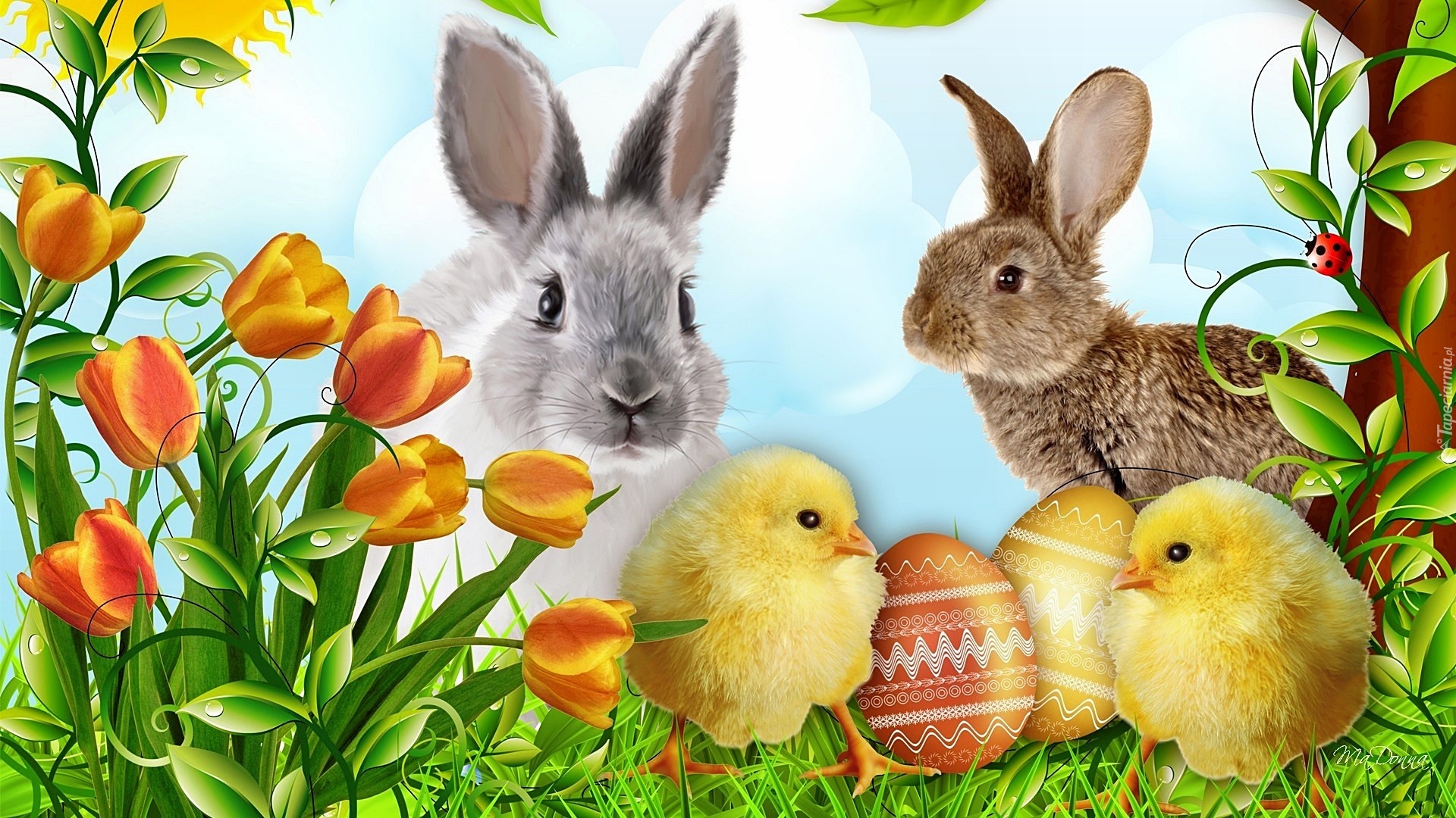 Edytor tapety: Króliczki, Kurczaczki, Jajka, Kwiaty, Wielkanoc