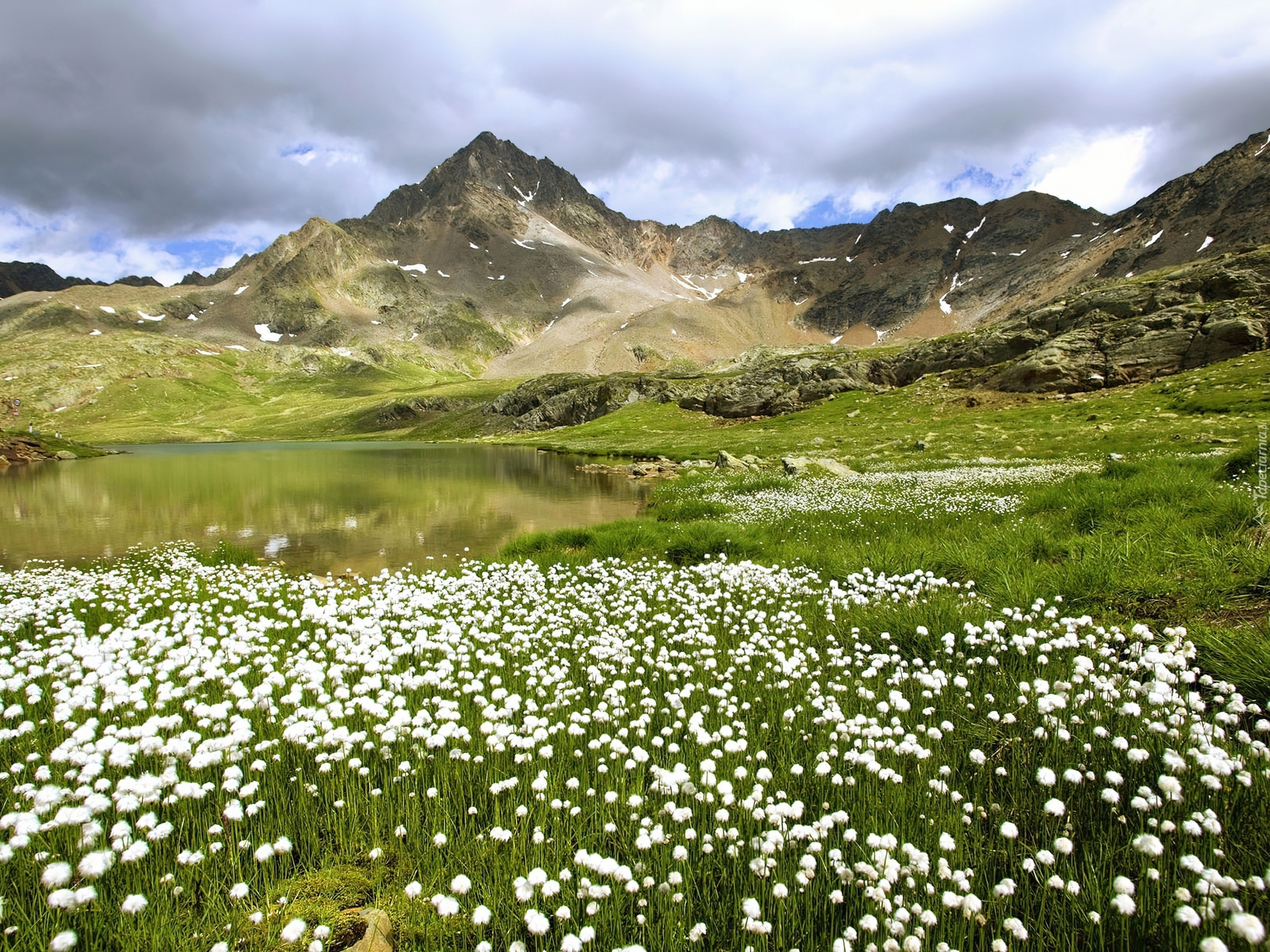 Edytor tapety: Jeziorko, Białe, Kwiatki, Góry