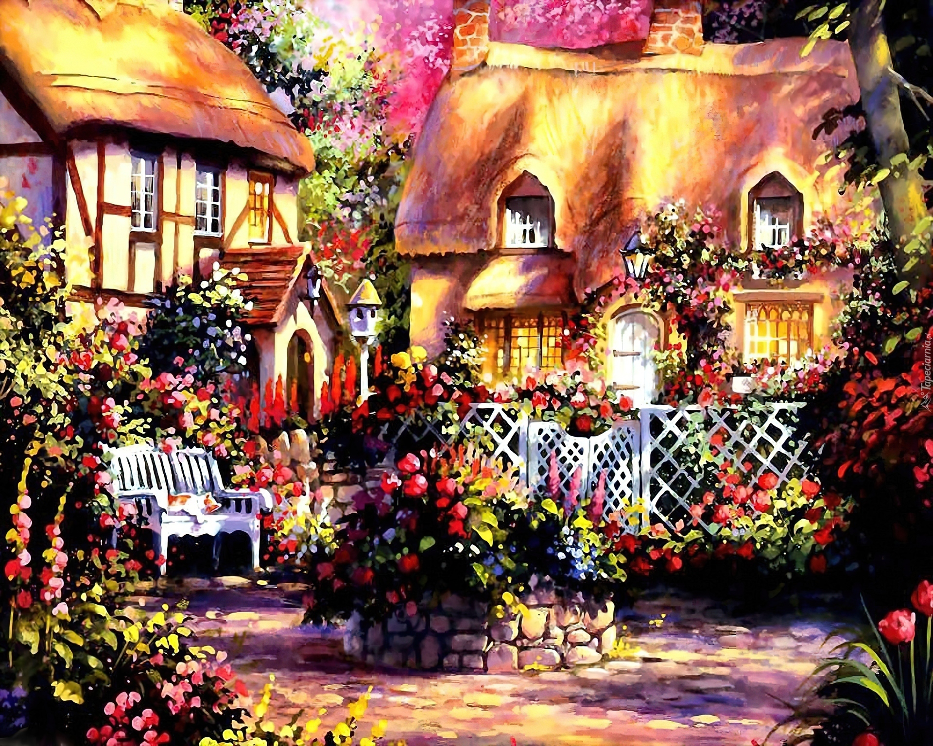 Edytor tapety: Domy, Ogród, Ławka, Kwiaty