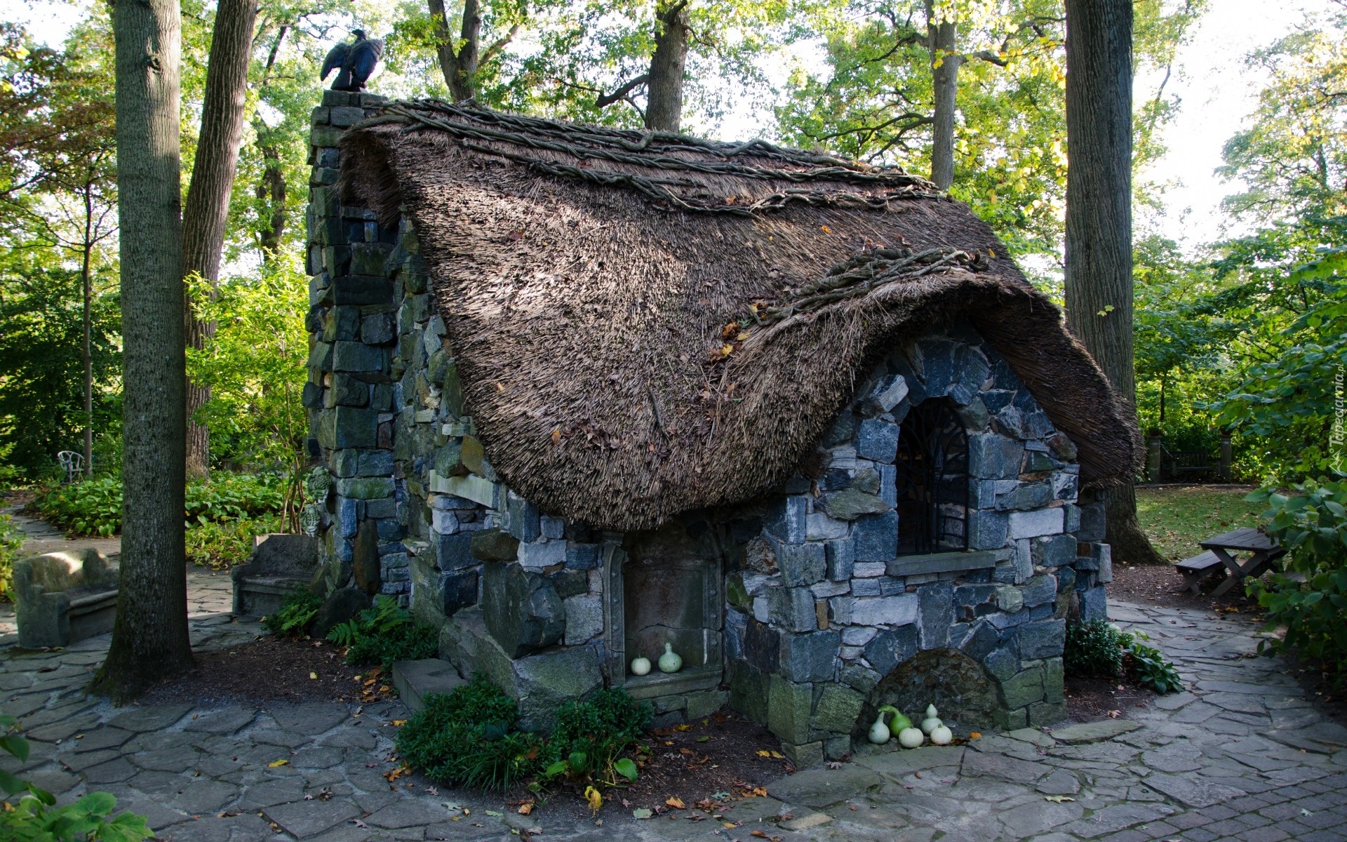 Edytor tapety: Park, Domek, Drzewa, Ławki