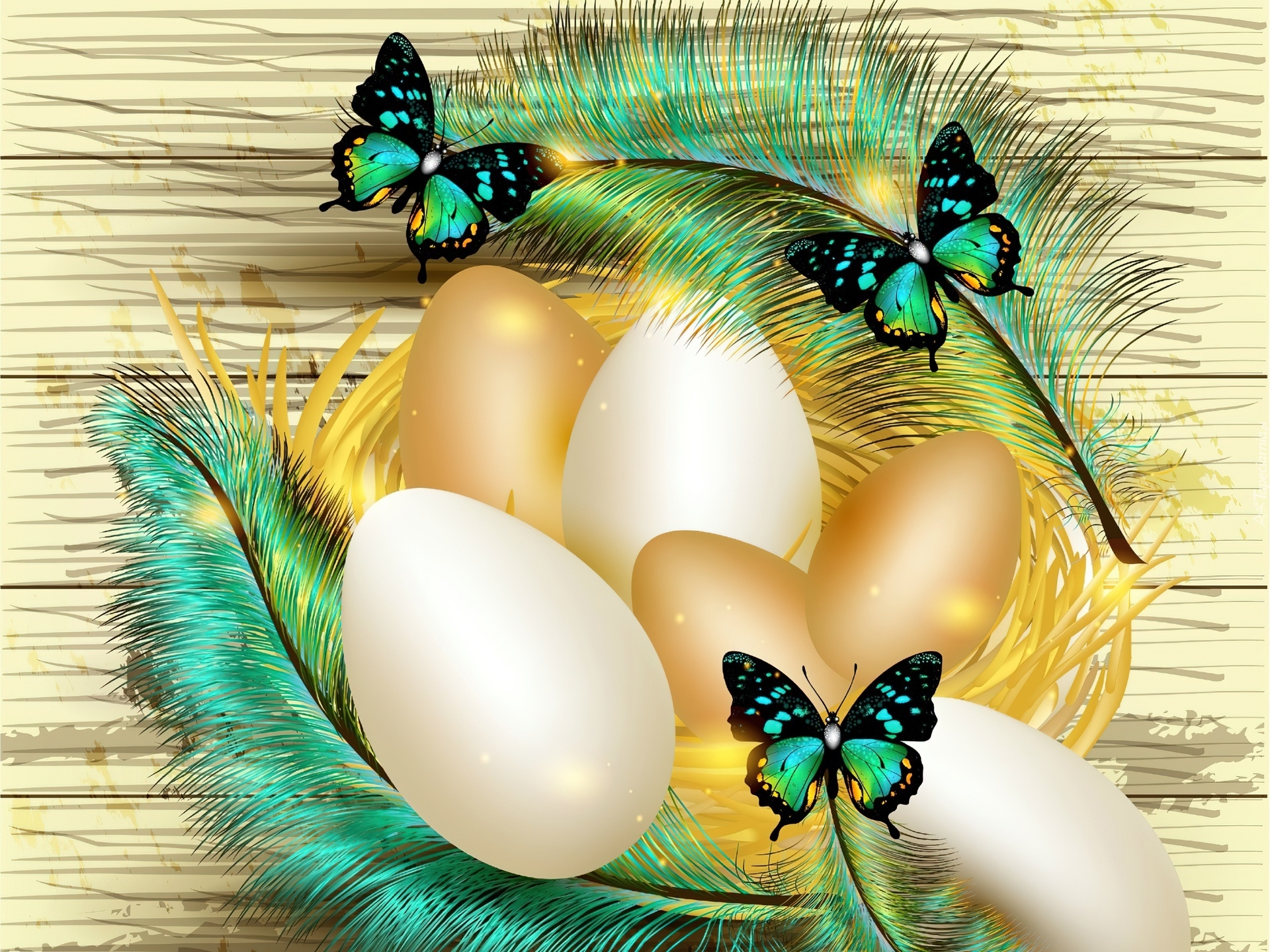 Edytor tapety: Jajka, Motyle, Pióra, Wielkanoc, Grafika
