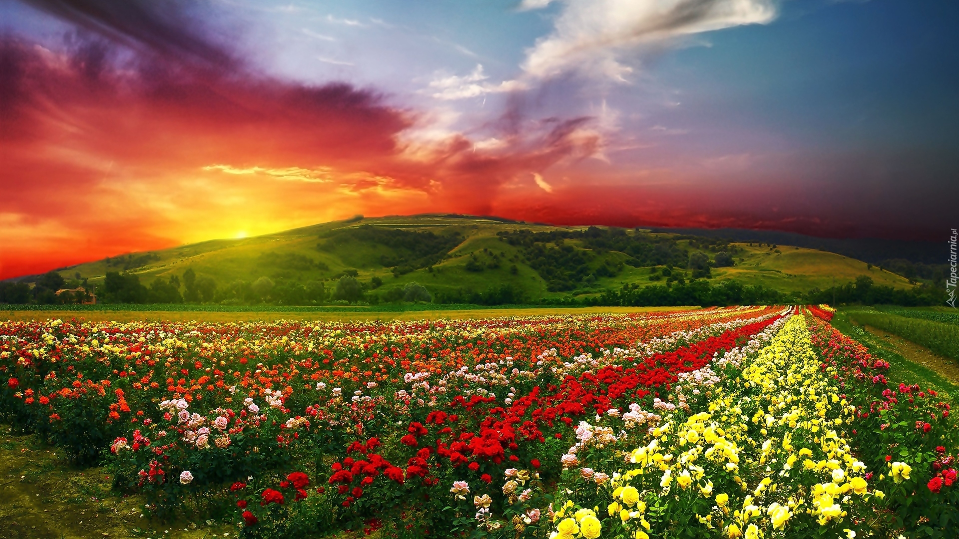 Edytor tapety: Góry, Zachód, Słońca, Kolorowe, Róże, Uprawa