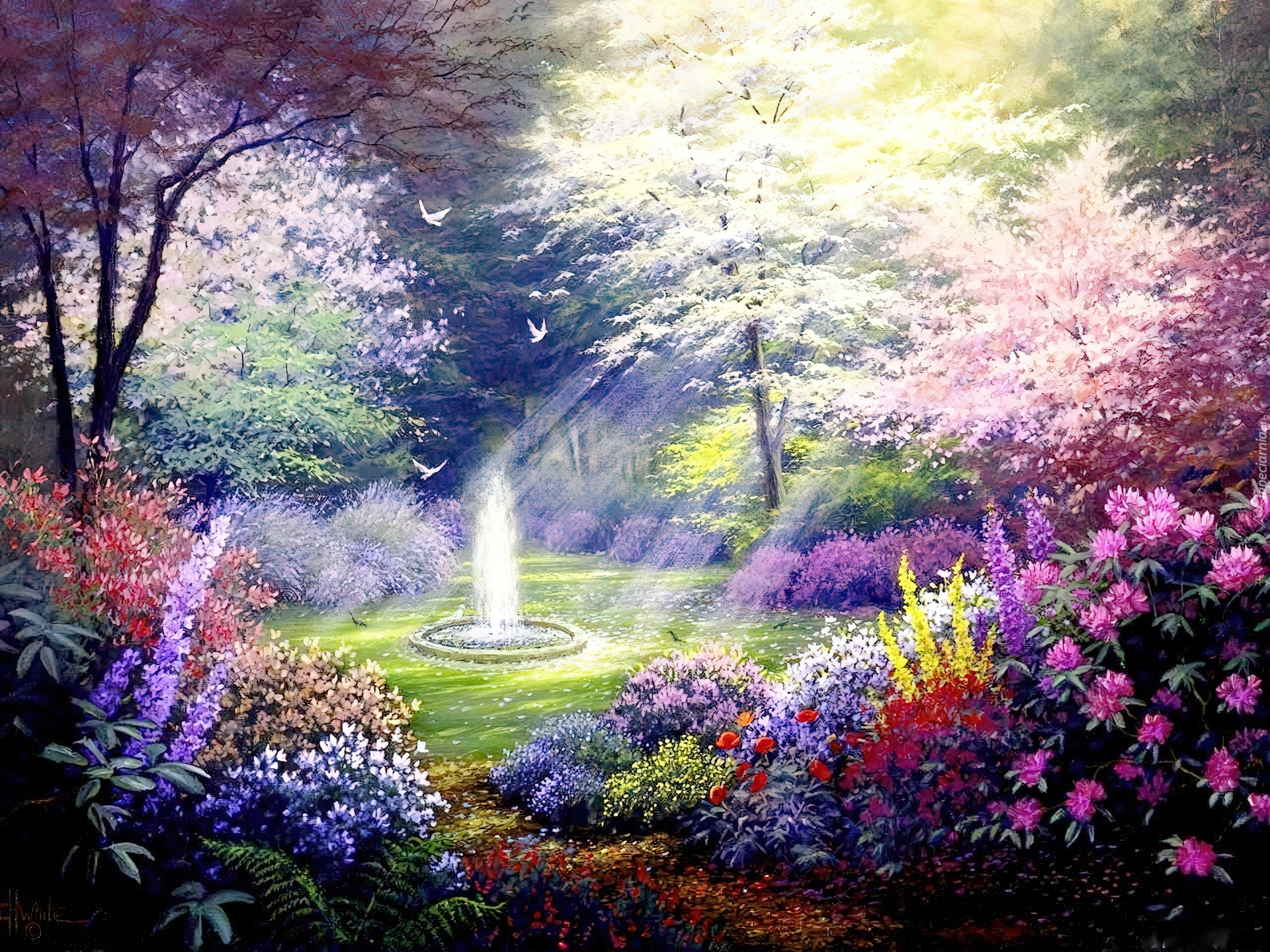 Edytor tapety: Ogród, Kwiaty, Fontanna, Promienie, Słoneczne