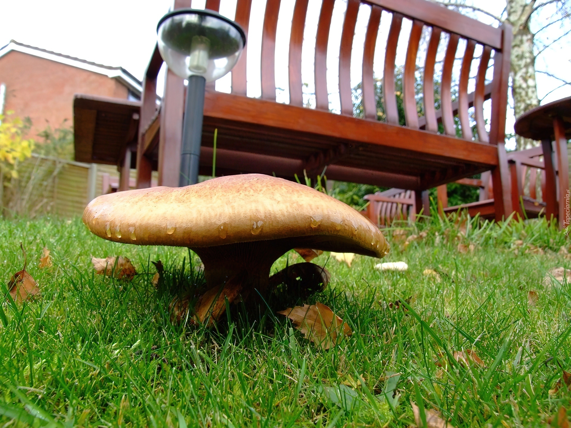 Edytor tapety: Ogród, Ławka, Latarnia, Trawa, Grzyb