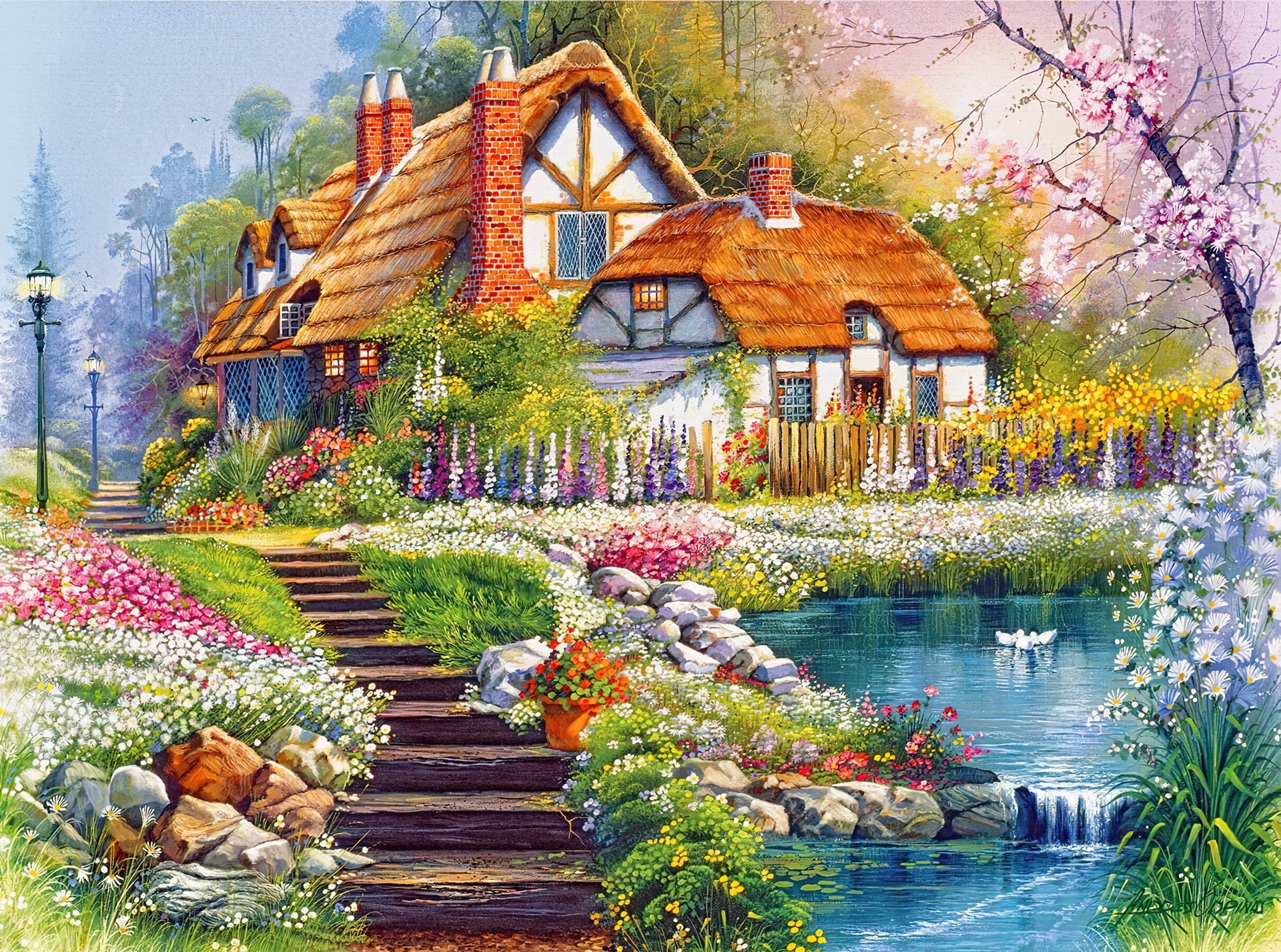 Edytor tapety: Dom, Ogród, Schody, Staw, Kwiaty