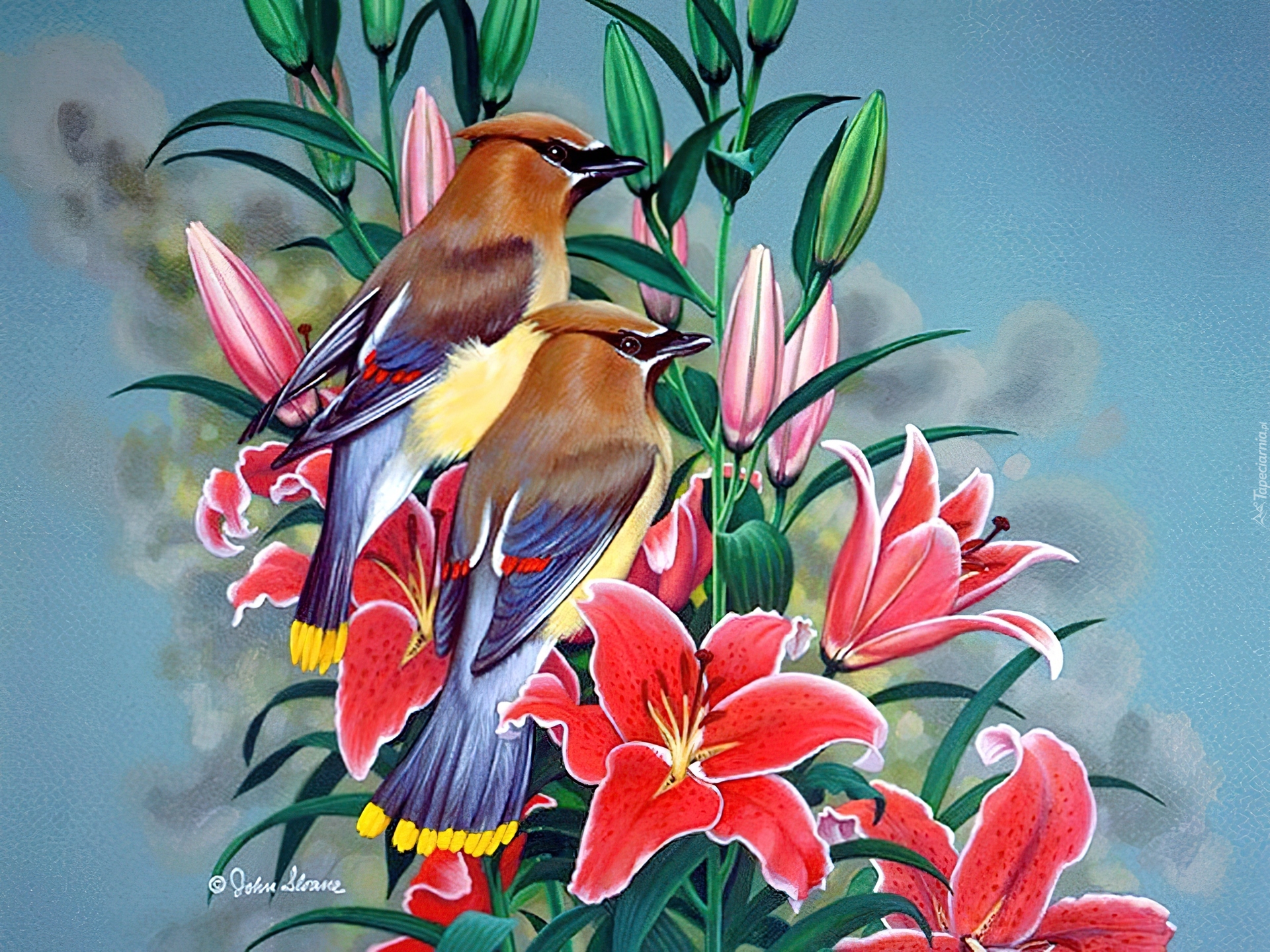 Edytor tapety: Czerwone, Lilie, Kolorowe, Ptaki