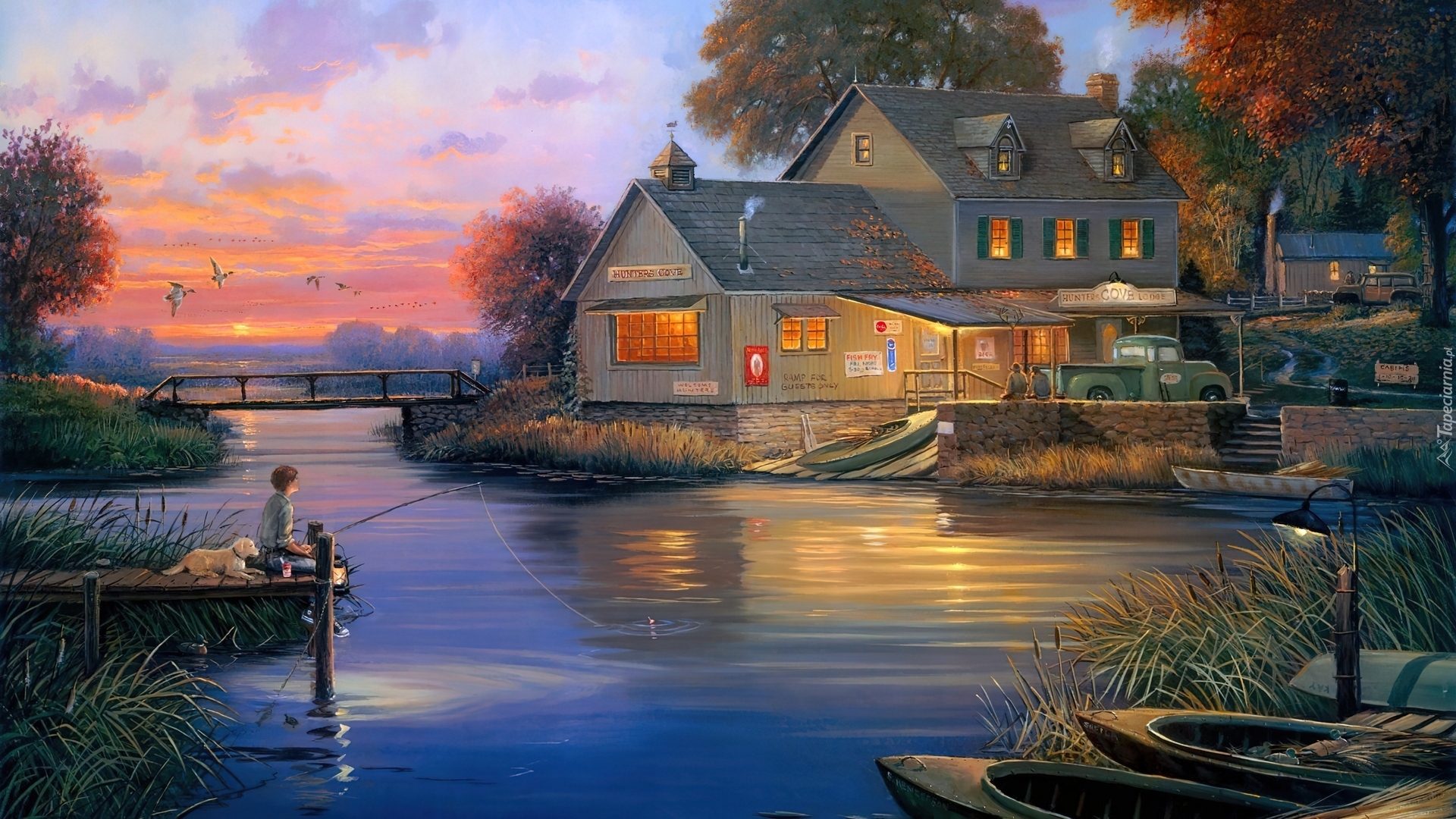 Edytor tapety: Tekstura, Domy, Jezioro, Most, Drzewa