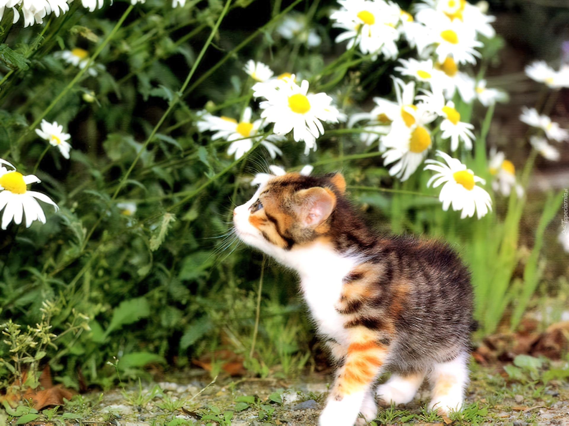 Edytor tapety: Mały, Kotek, Łąka, Białe, Margerytki