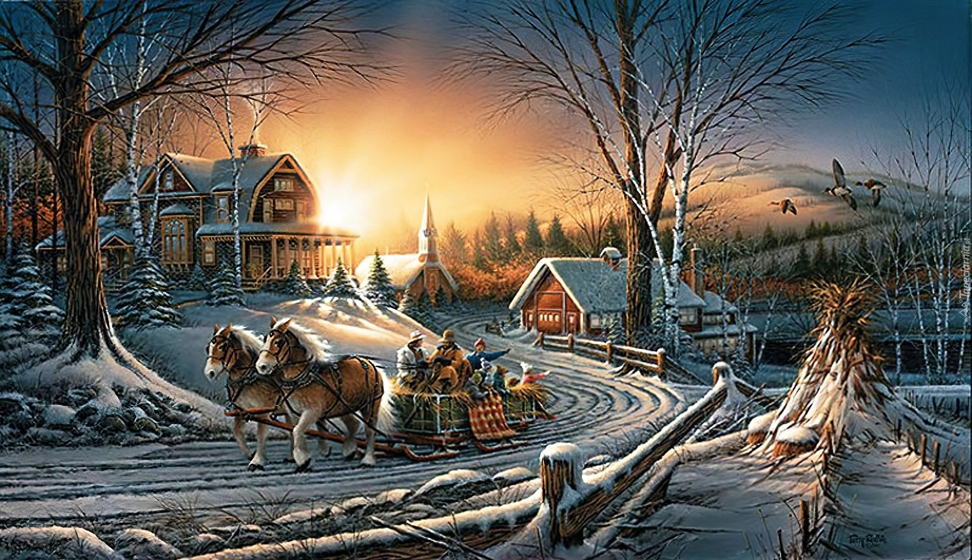 Edytor tapety: Zima, Droga, Sanie, Domy, Zachód, Słońca