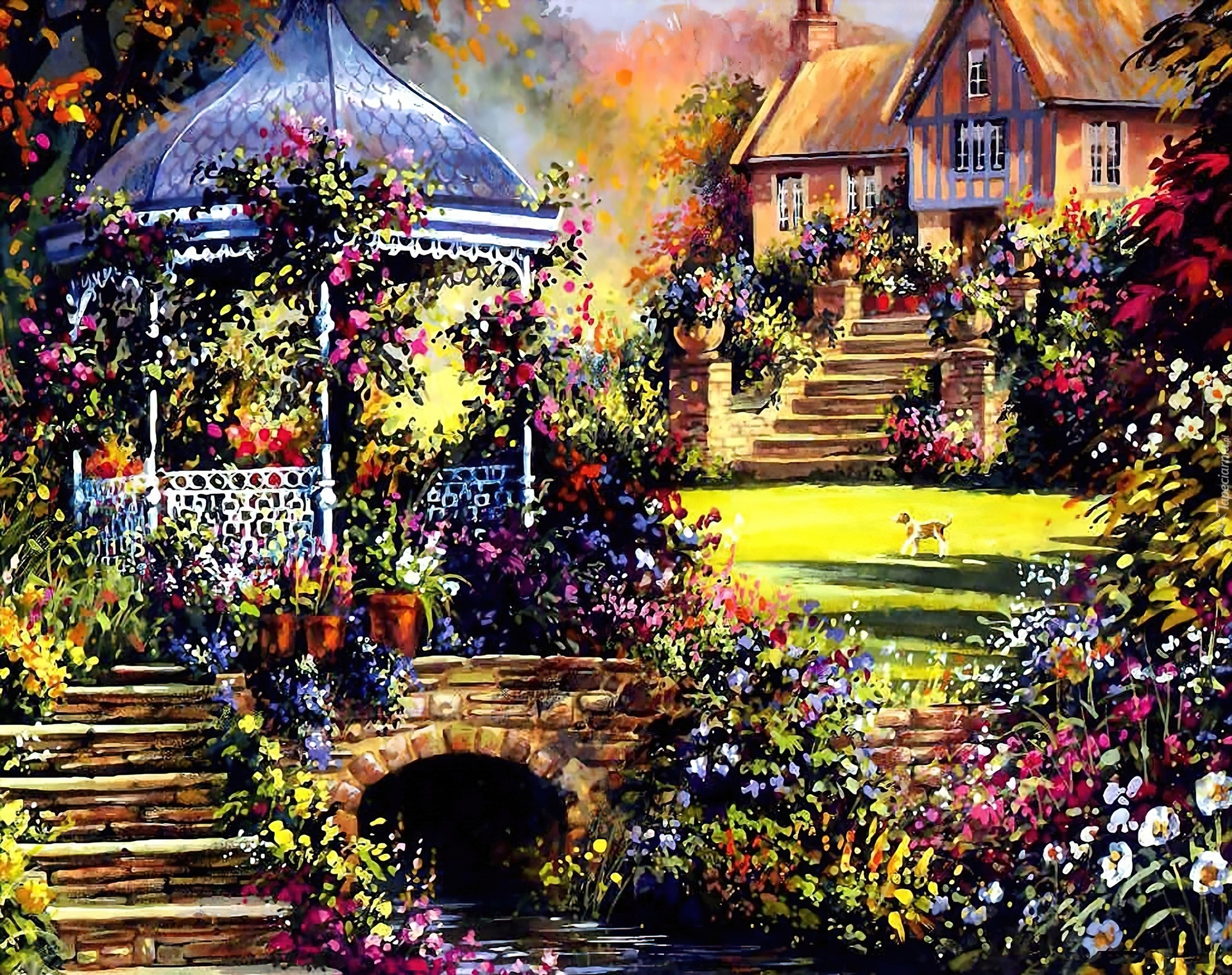 Edytor tapety: Ogród, Dom, Altanka, Kwiaty, Schody
