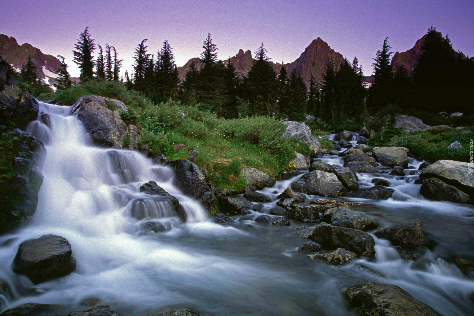 Edytor tapety: Wodospad, Rzeka, Kamienie, Góry, Drzewa