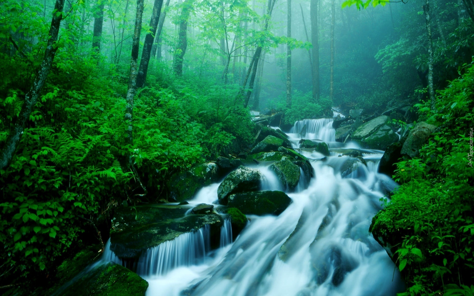 Edytor tapety: Wodospad, Las, Kamienie, Mgła