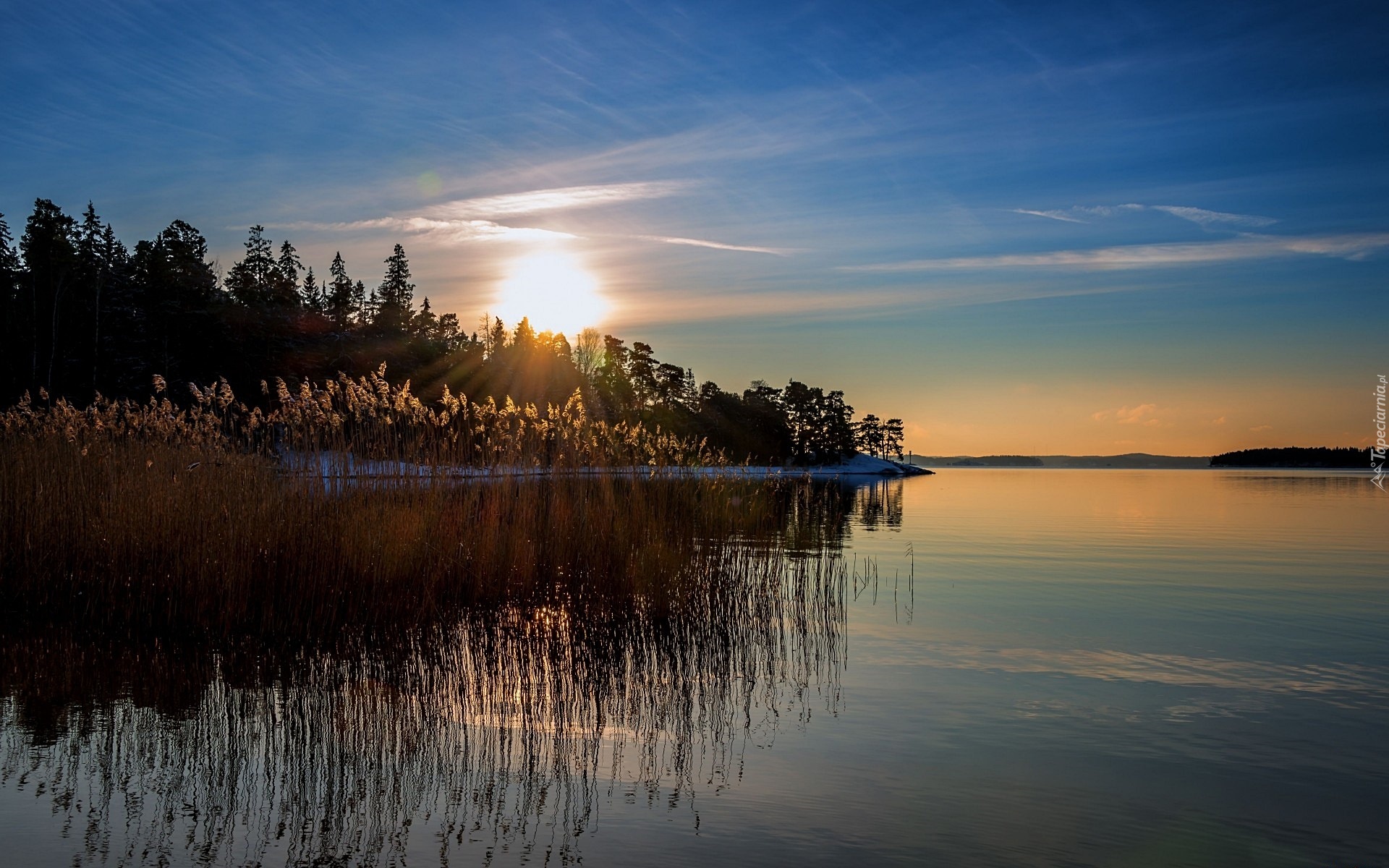 Edytor tapety: Jezioro, Szuwary, Wschód, Słońca