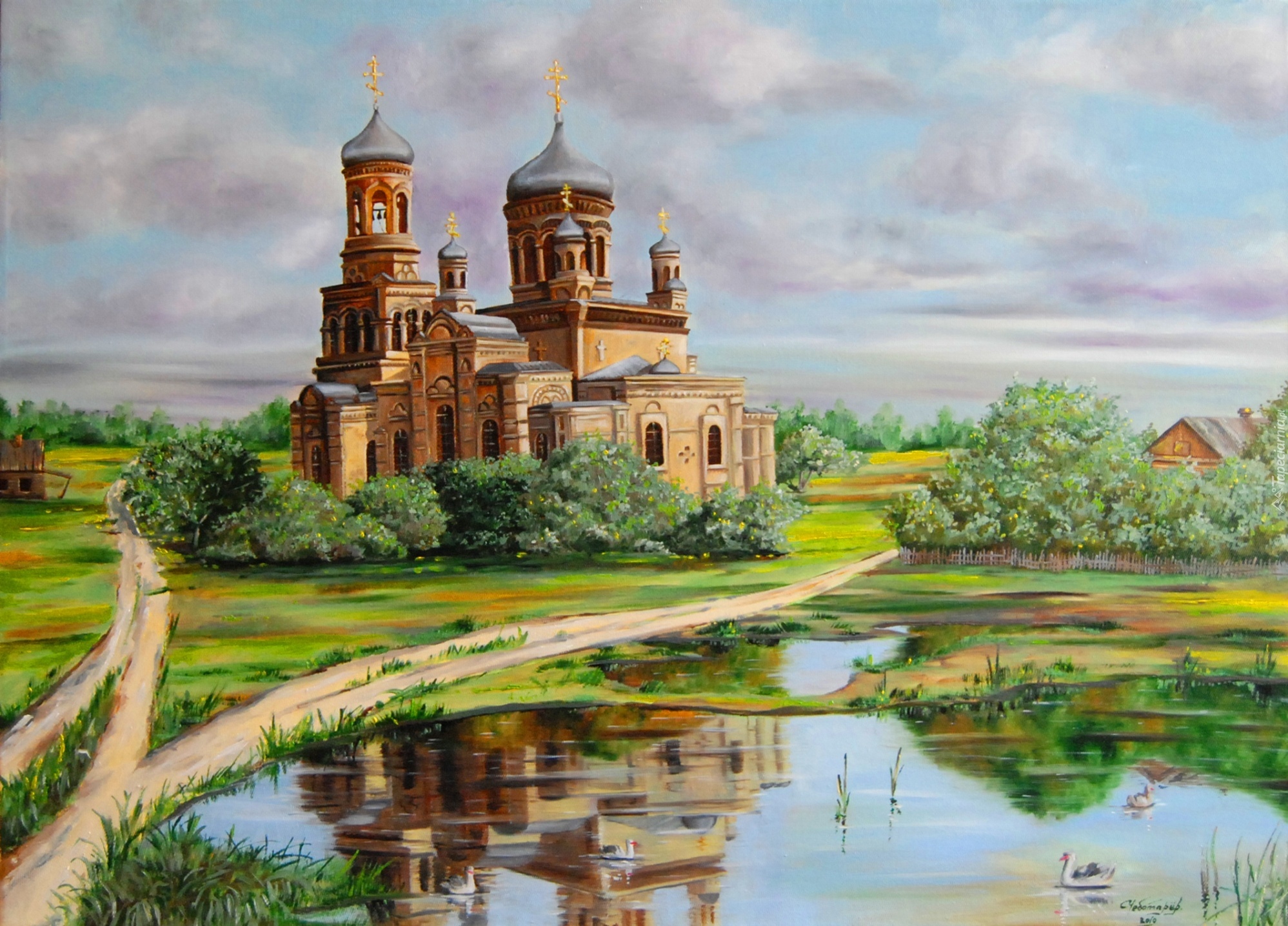 Edytor tapety: Kościół, Cerkiew, Dróżki, Staw, Odbicie